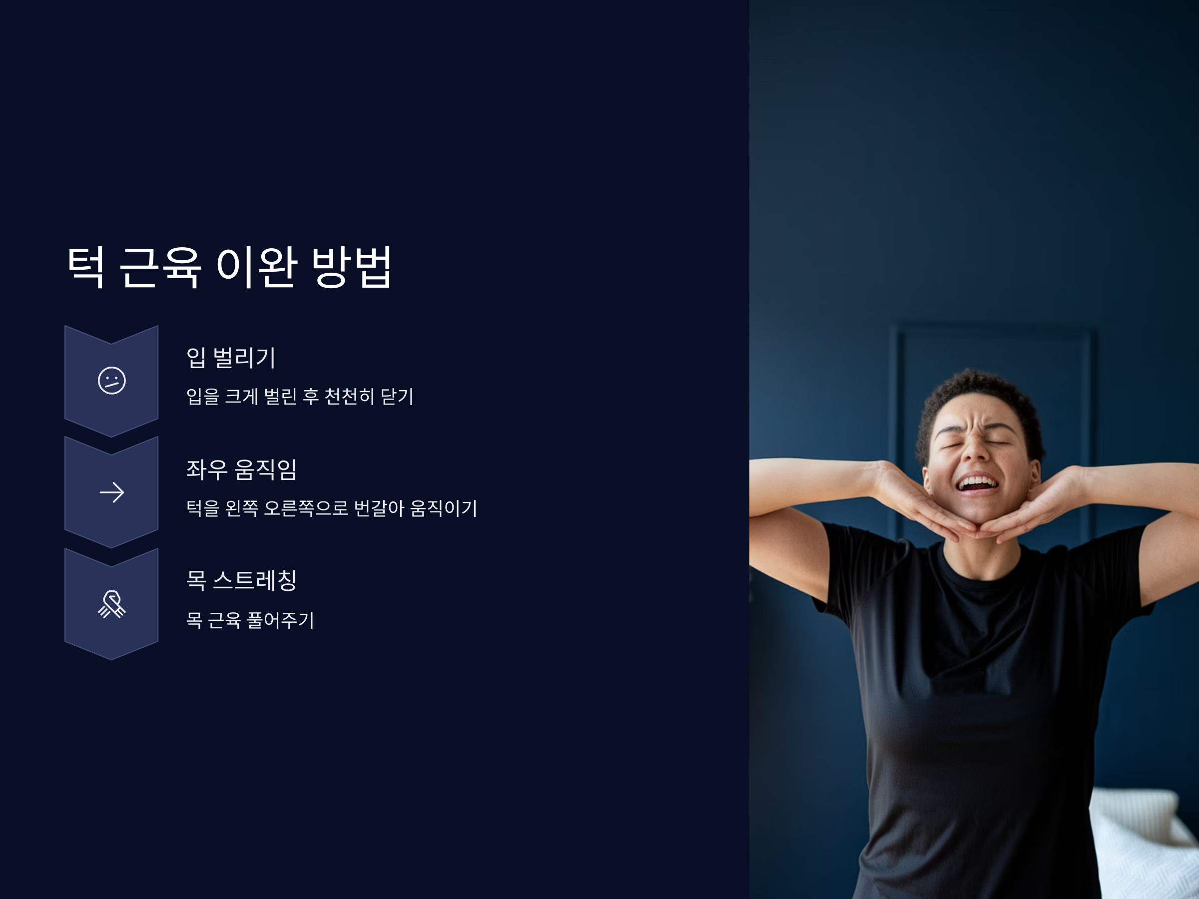 가장 기본적인 턱 근육 이완 방법 중 하나는 입을 크게 벌린 후 천천히 입을 닫는 동작을 반복하는 것입니다. 이를 통해 턱 근육의 긴장을 풀어주고, 입을 너무 많이 다물지 않도록 유도할 수 있습니다. 또 다른 방법은 턱을 왼쪽과 오른쪽으로 번갈아 가며 움직이는 것입니다. 이 운동은 턱 관절을 부드럽게 풀어주고, 근육의 긴장을 완화하는 데 효과적입니다.
