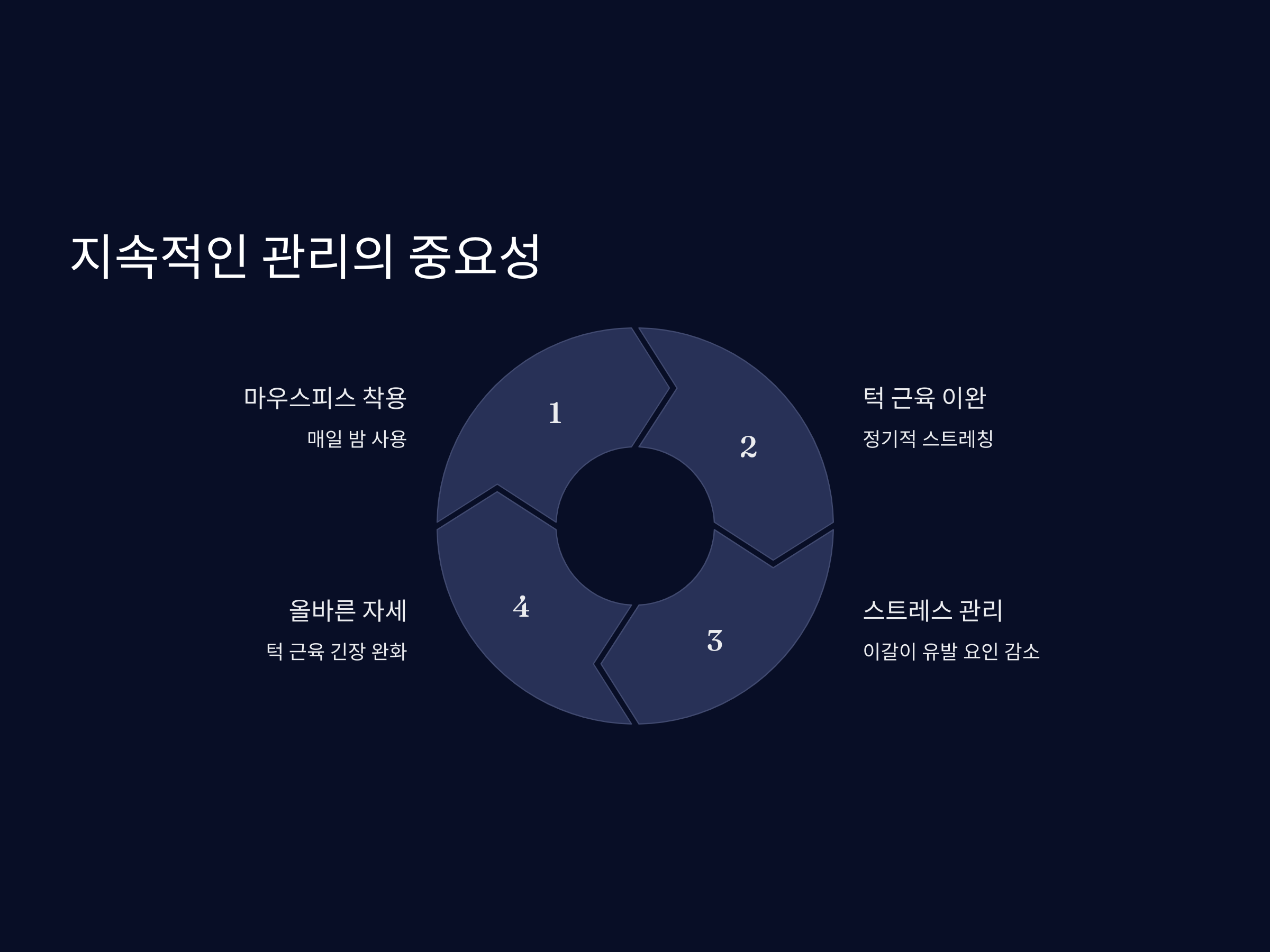 이갈이를 완화하려면 단기적인 노력보다는 지속적인 관리가 중요합니다. 마우스피스 착용과 턱 근육 이완은 일시적인 해결책이 아닌, 꾸준히 실천해야 하는 습관입니다. 이를 통해 점차적으로 턱 근육의 긴장이 줄어들고, 이갈이의 발생 빈도도 감소할 수 있습니다.