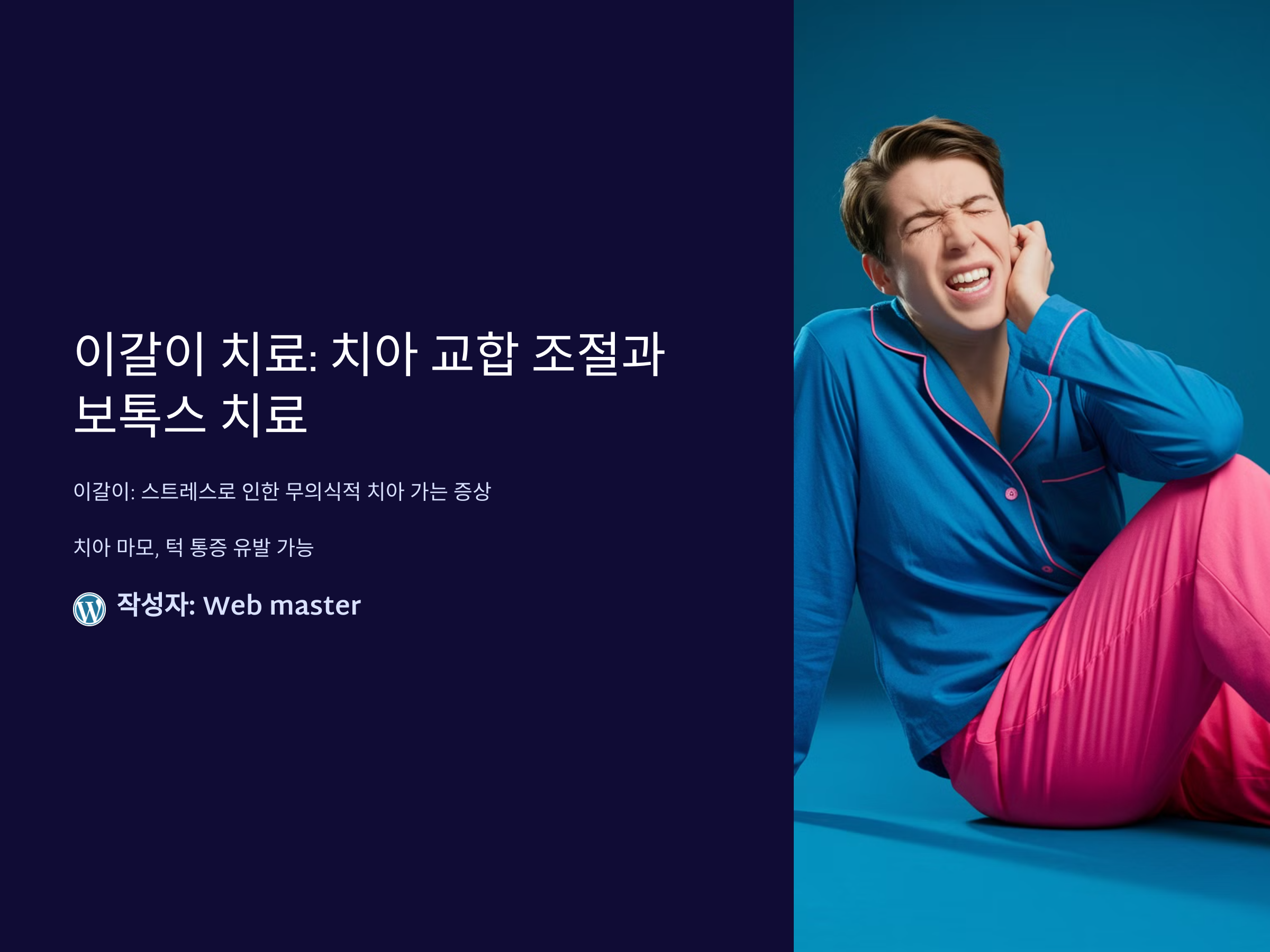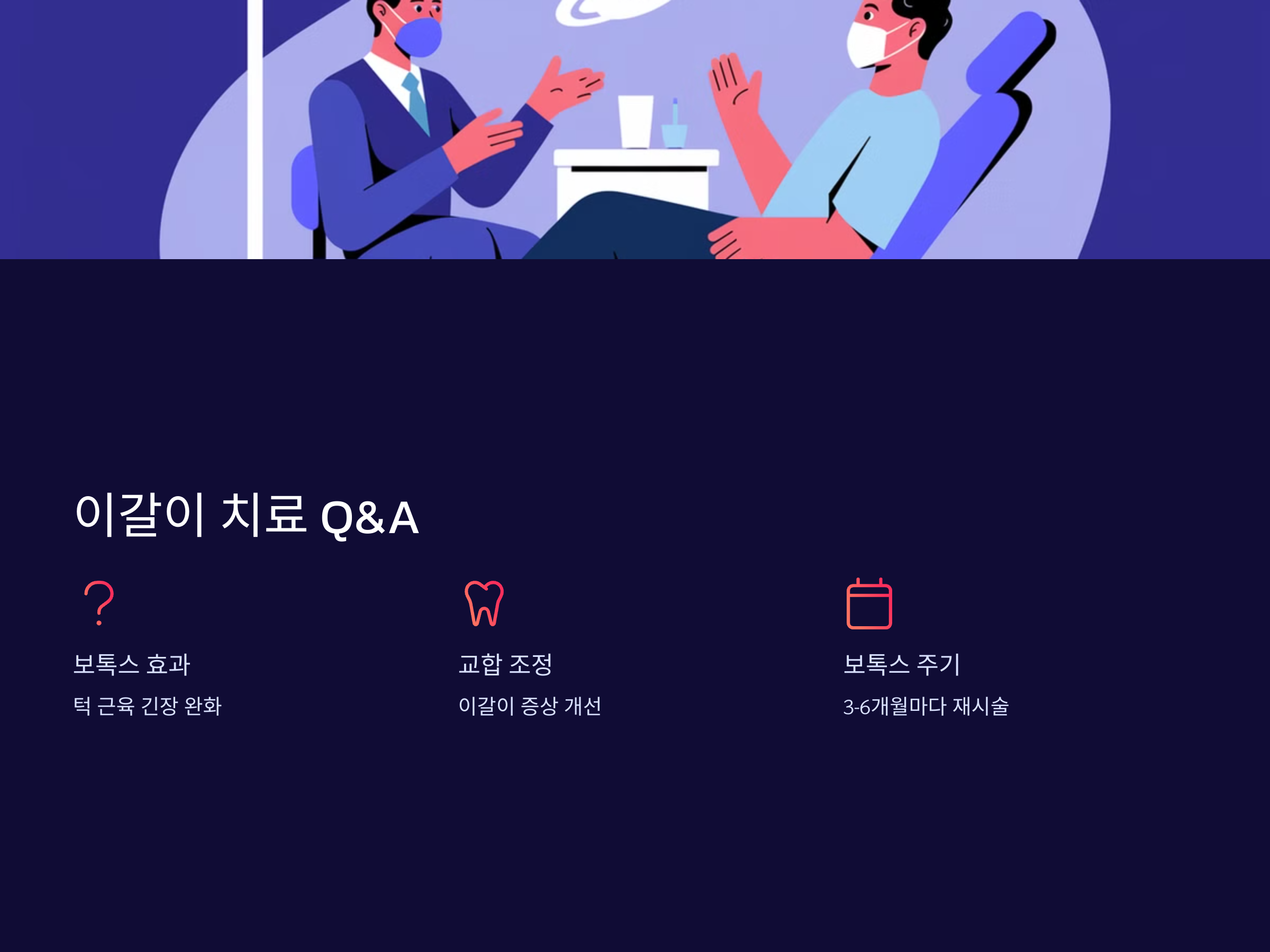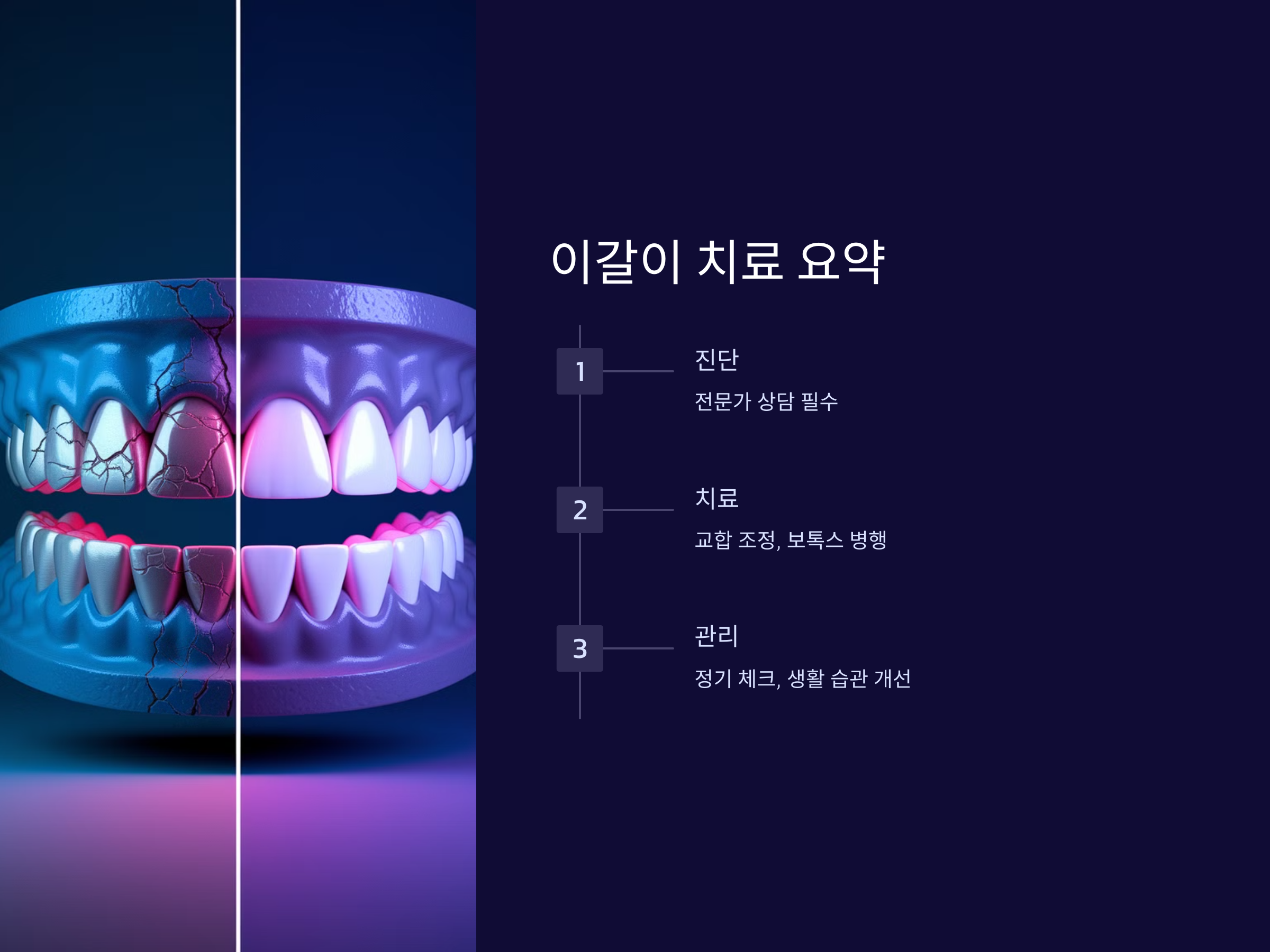 이갈이 치료는 적절한 진단과 전문가의 처방이 필요하므로, 증상이 있을 경우 빠르게 치과를 방문하여 치료를 받는 것이 중요합니다. 이갈이를 예방하고 치료하는 데 있어 치아 교합 조정과 보톡스 치료는 매우 중요한 역할을 하며, 환자의 삶의 질을 크게 개선할 수 있습니다.