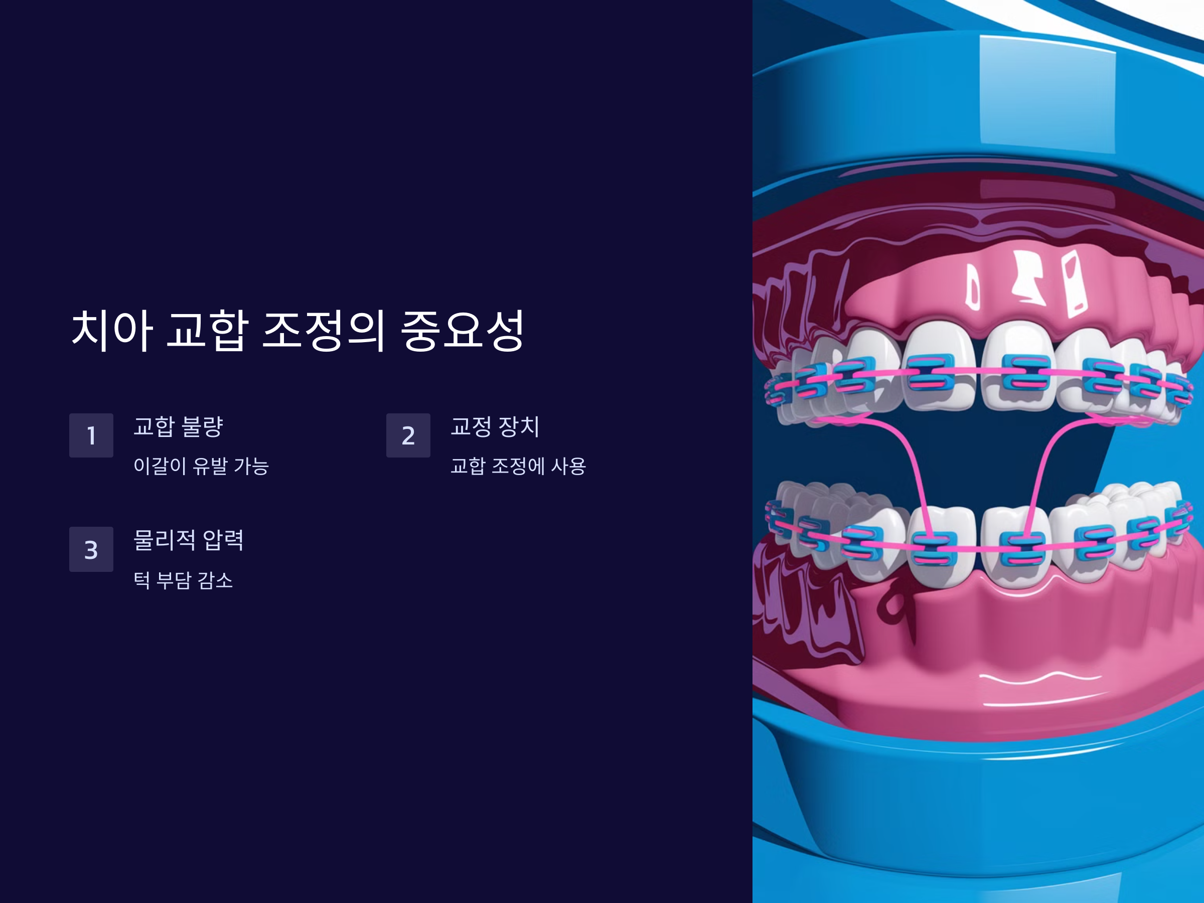 치아 교합 조정은 보통 치아 교정 장치를 사용하거나, 교정 치료를 통해 이루어집니다. 교합이 잘 맞도록 조정되면 이갈이 증상도 개선될 수 있습니다. 또한, 교정치료와 함께 이를 다듬거나 보철물을 사용하는 방법도 있습니다. 이를 통해 물리적인 압력을 줄이고 턱의 부담을 줄여 이갈이를 방지할 수 있습니다.