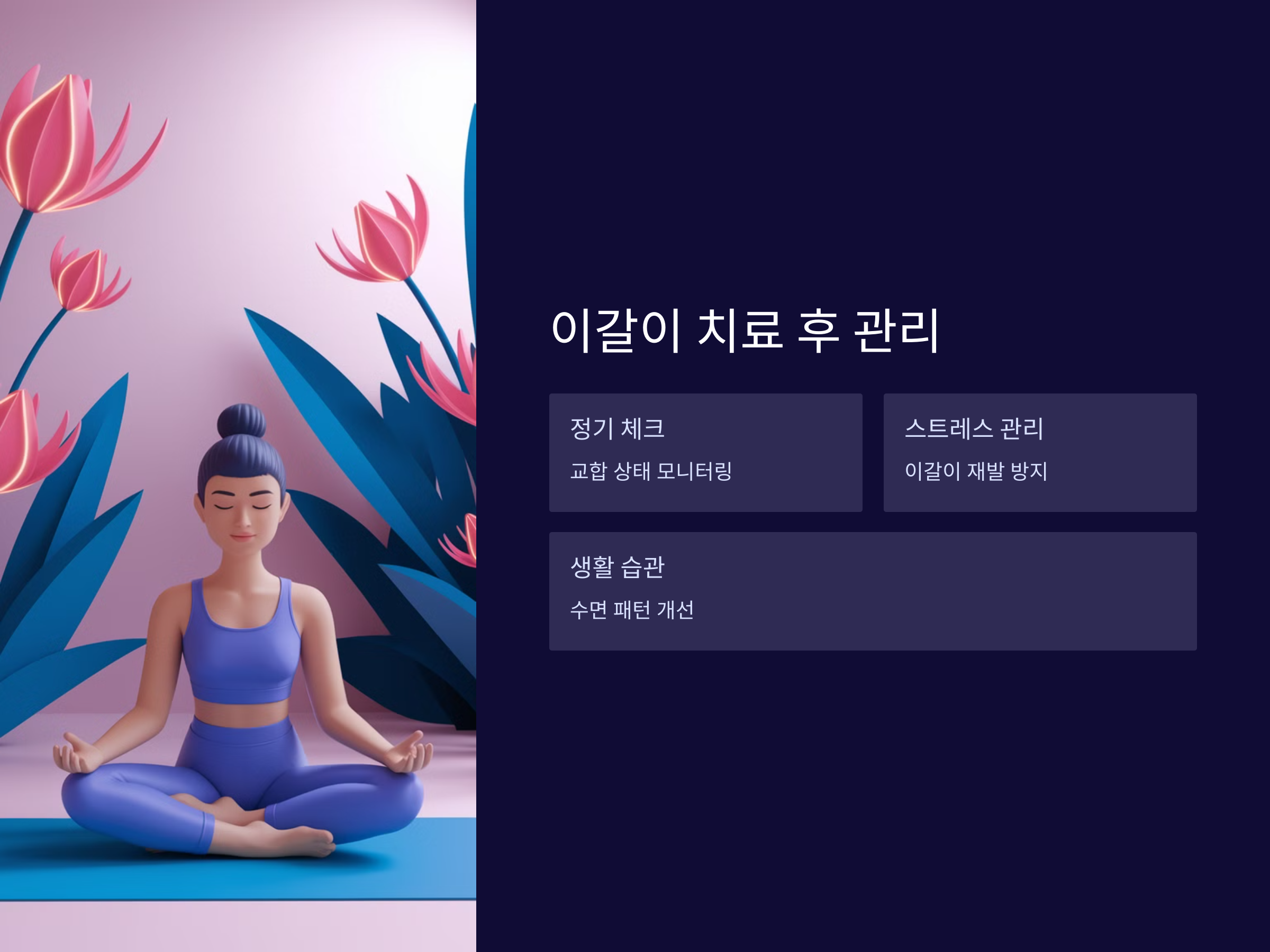 치아 교합 조정과 보톡스 치료를 받은 후에는 적절한 관리가 필요합니다. 치료 후에는 일정 기간 동안 교합의 상태를 체크하고, 보톡스 치료가 효과적인지 모니터링해야 합니다. 또한, 이갈이가 재발하지 않도록 스트레스 관리나 생활 습관 개선이 중요합니다.