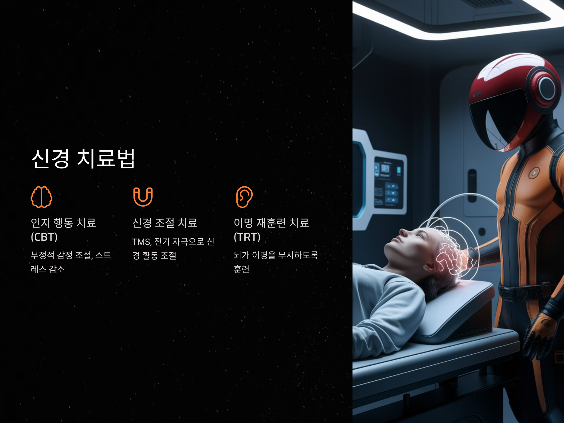 - 이명 재훈련 치료(TRT): 뇌가 이명을 무시하도록 훈련하여 인식을 줄이는 방식입니다.