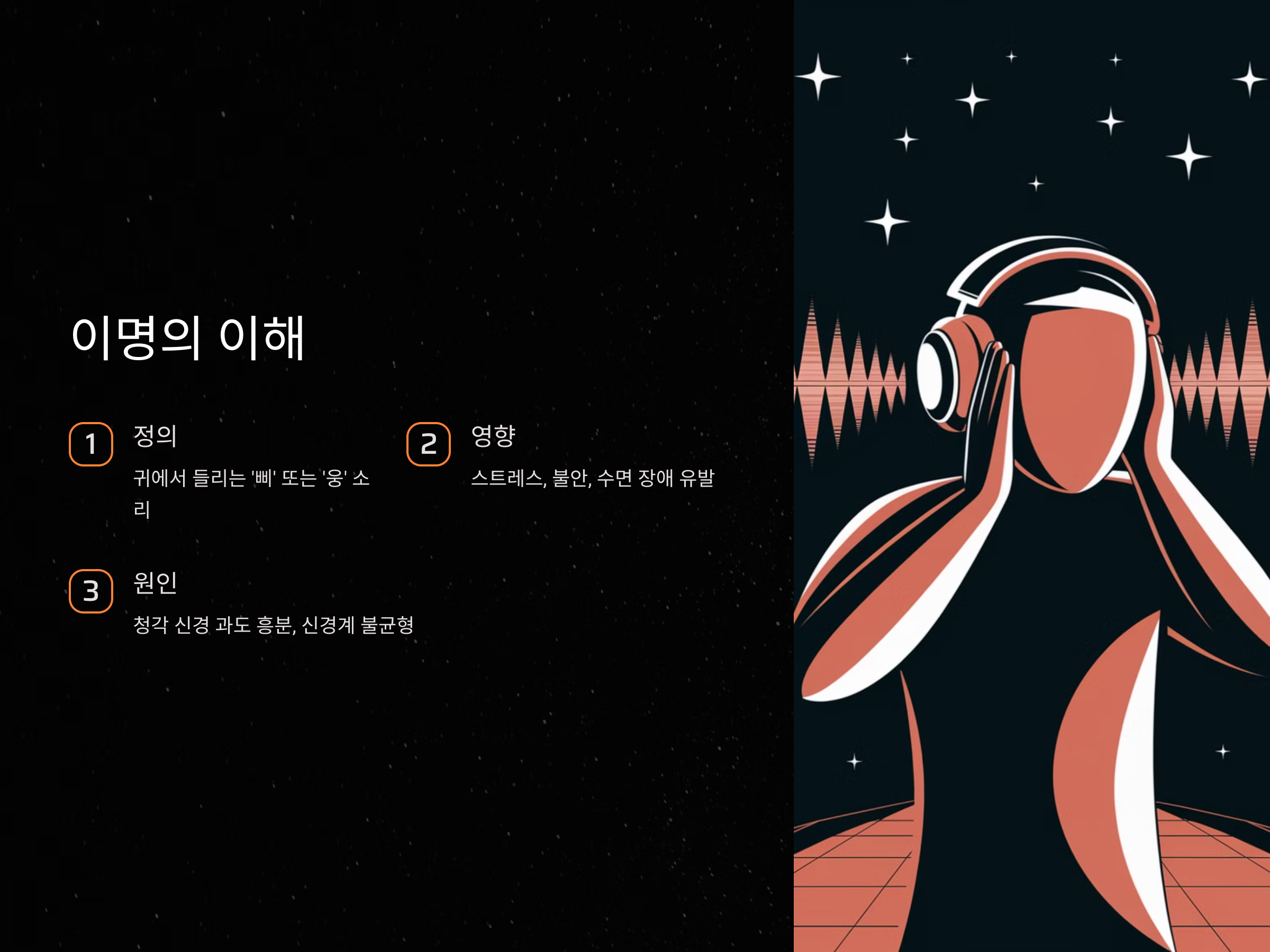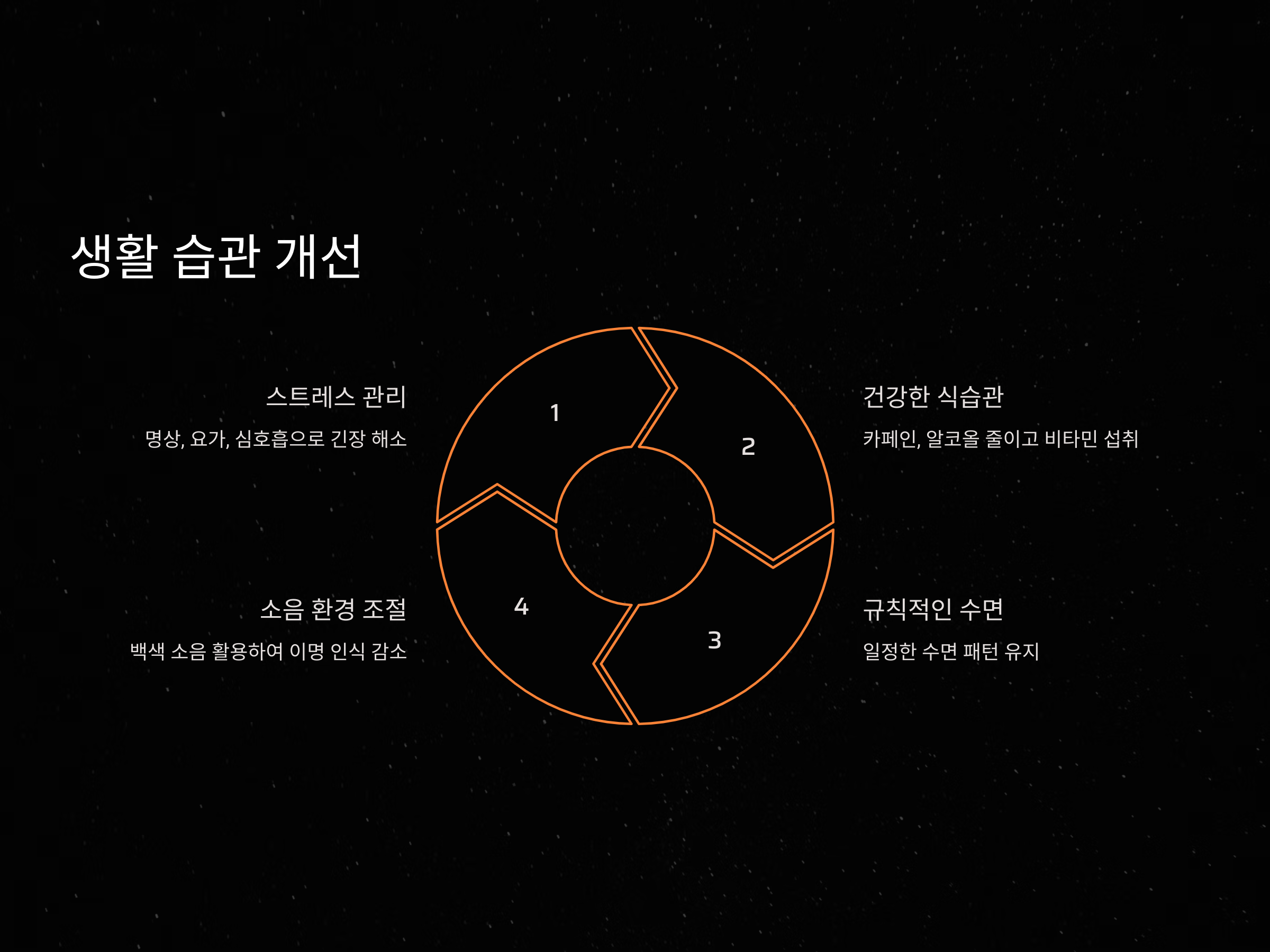 - 소음 환경 조절: 너무 조용한 환경보다 백색 소음(화이트 노이즈)을 활용하여 이명 소리를 덜 인식하도록 유도하는 것이 좋습니다.