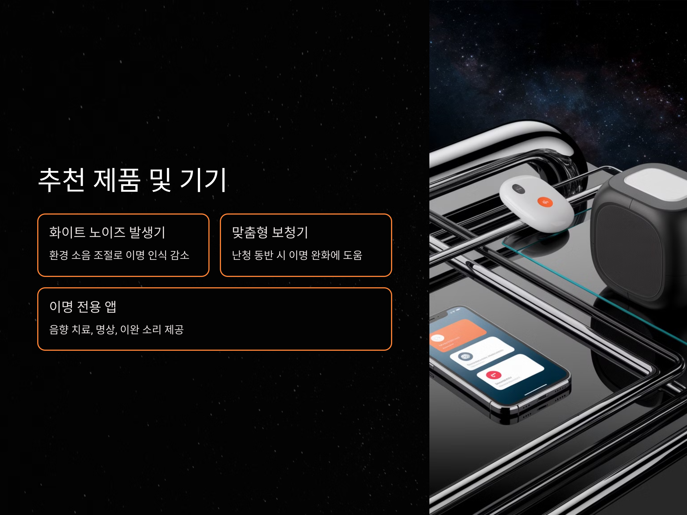 - 맞춤형 보청기: 난청을 동반한 경우, 적절한 보청기가 이명을 완화할 수 있습니다.