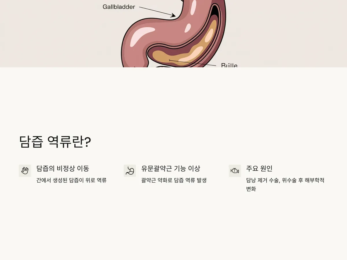 원인으로는 담낭 제거 수술, 위수술 후의 해부학적 변화, 유문괄약근 기능 이상, 특정 약물 복용 등이 있으며, 만성적으로 방치될 경우 식도염, 위염, 십이지장염 등의 합병증으로 이어질 수 있습니다. 담즙 역류는 정밀 검사를 통해 확진이 가능하며, 치료는 약물 요법과 함께 식이요법, 자세 교정, 수면 자세 개선이 병행되어야 합니다.