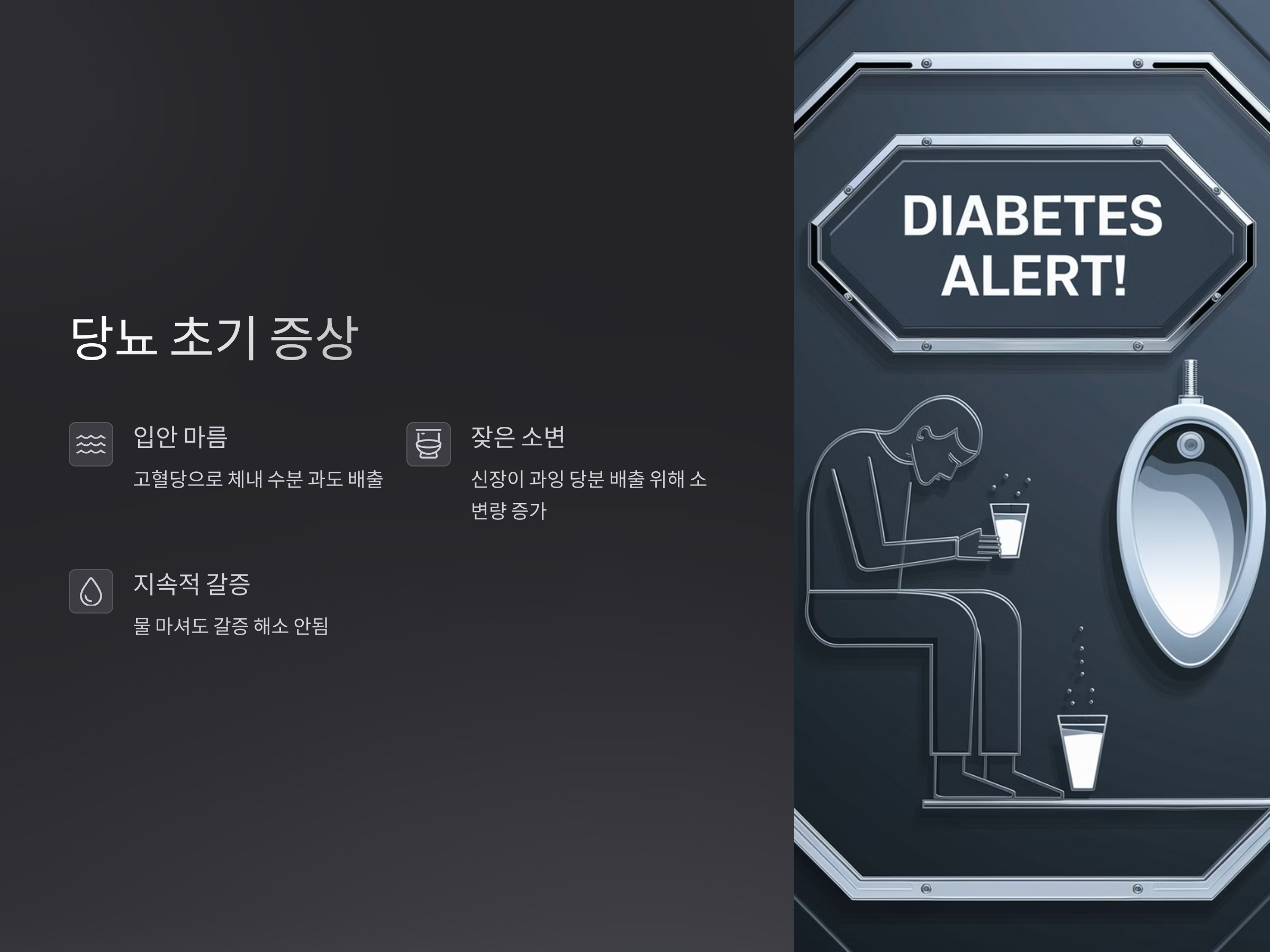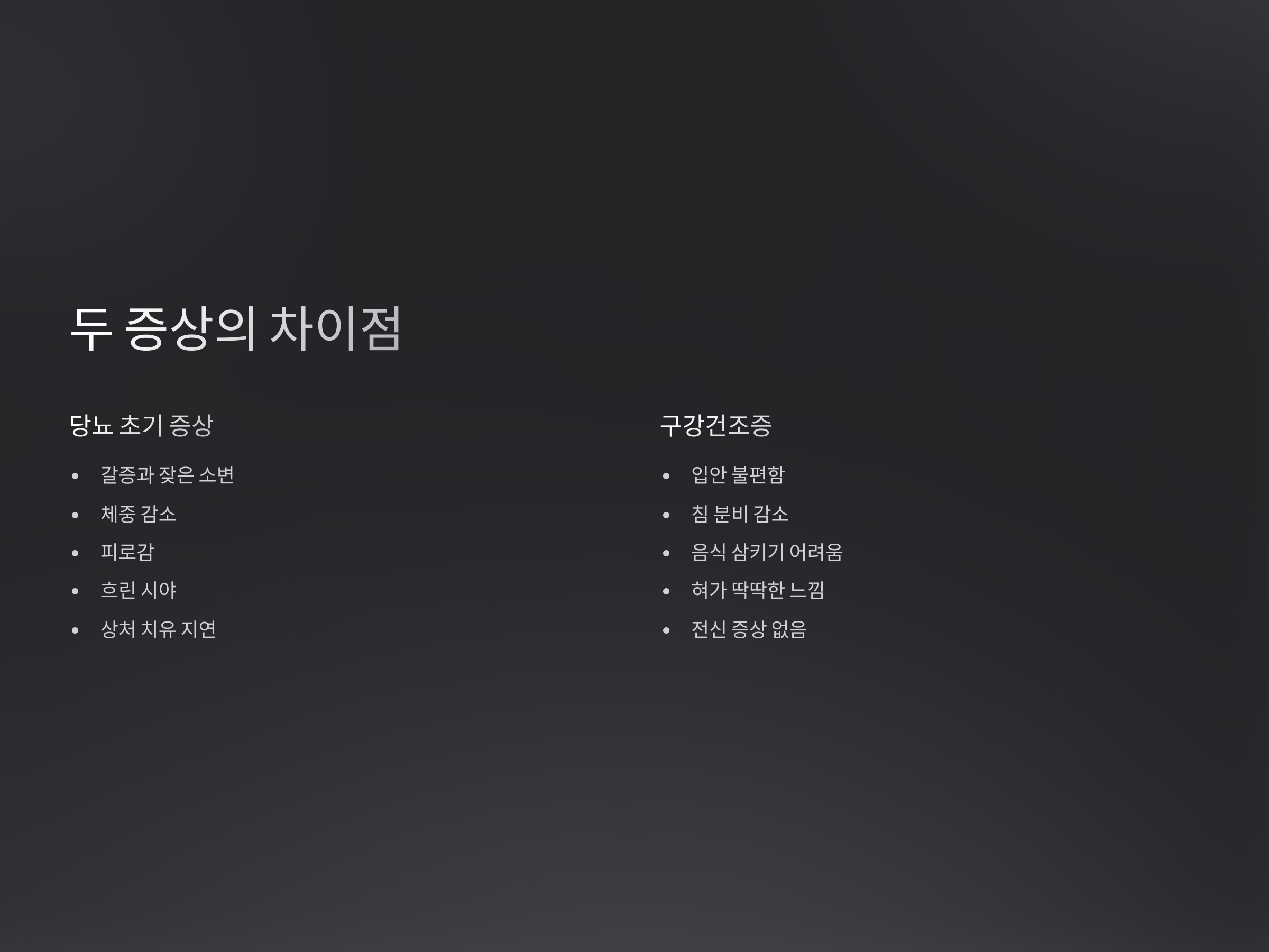 당뇨 초기 증상과 구강건조증은 입안이 마르고 갈증이 심하다는 공통된 증상을 보이지만, 그 원인과 관련된 다른 증상들에서 차이를 보입니다. 당뇨는 갈증 외에도 체중 감소, 피로, 흐린 시야, 상처가 잘 아물지 않는 등의 증상을 동반합니다. 특히 소변을 자주 보는 현상과 무기력증이 중요한 신호로, 이를 통해 당뇨를 의심할 수 있습니다.