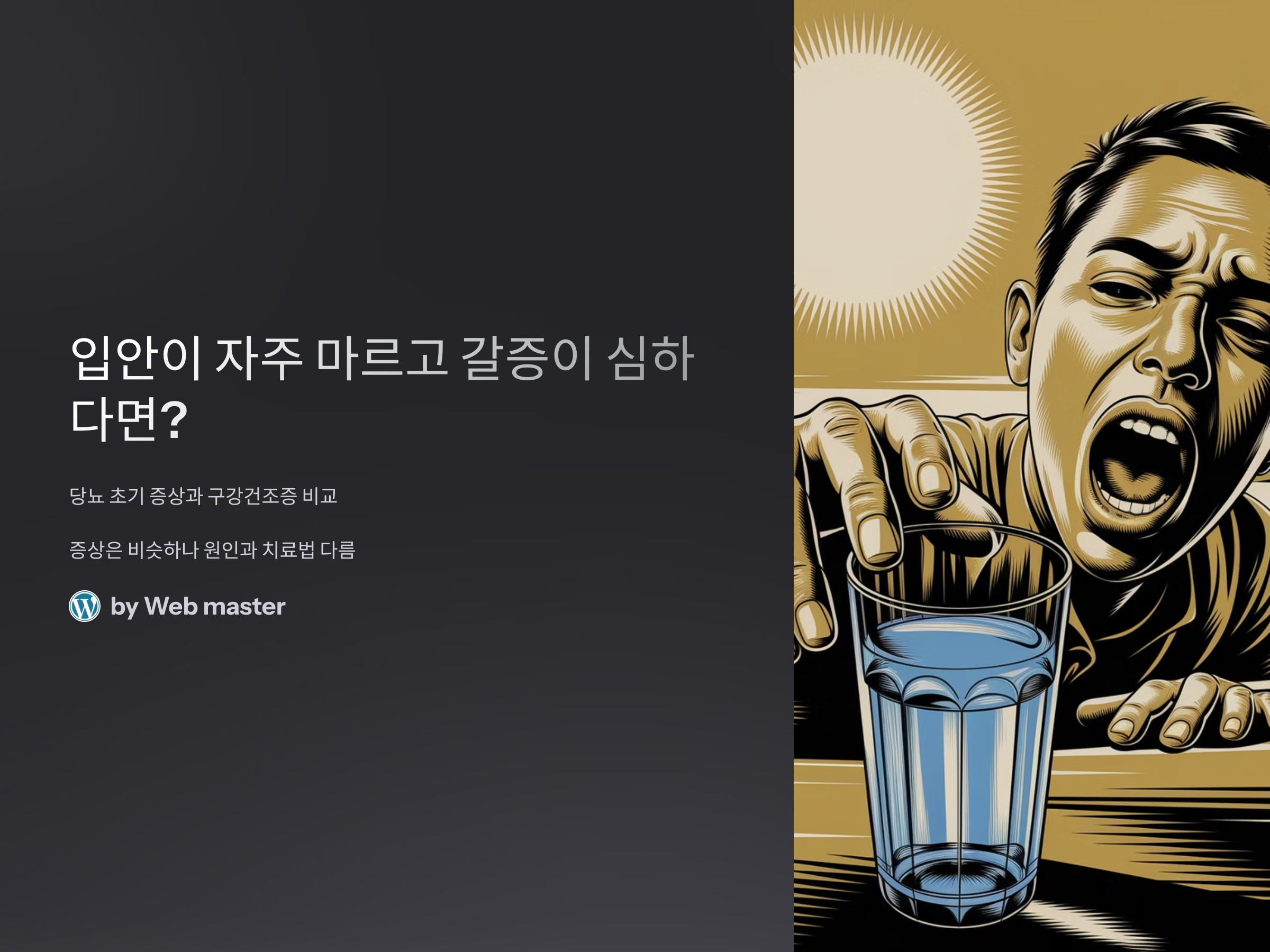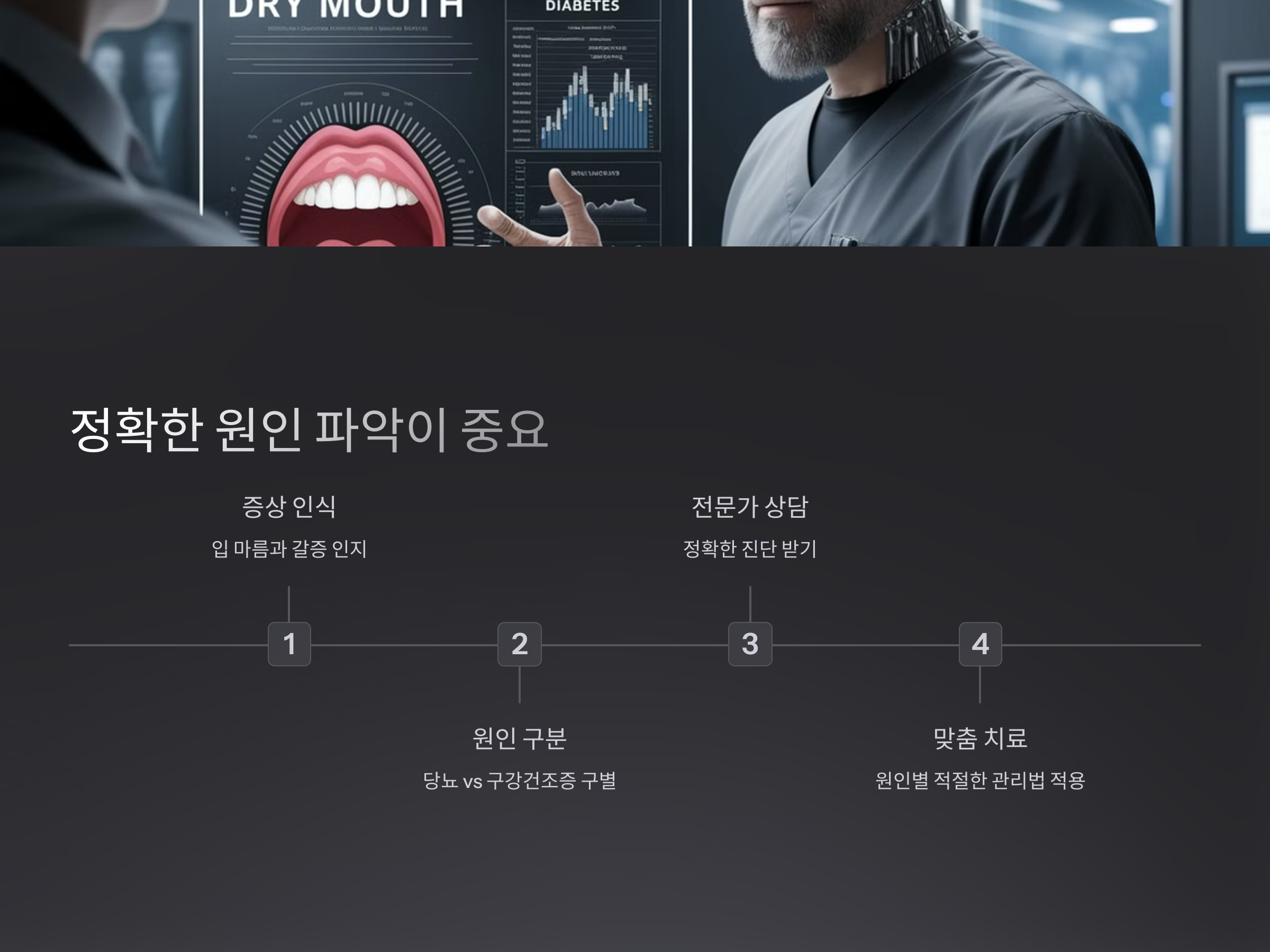 입안이 자주 마르고 갈증을 느낄 때는 단순히 일시적인 문제일 수도 있지만, 당뇨와 같은 심각한 질병의 초기 증상일 수도 있습니다. 구강건조증도 다른 원인에 의해 발생할 수 있기 때문에, 증상이 지속되거나 더 심해질 경우 전문가와 상담하여 정확한 진단을 받는 것이 중요합니다.
