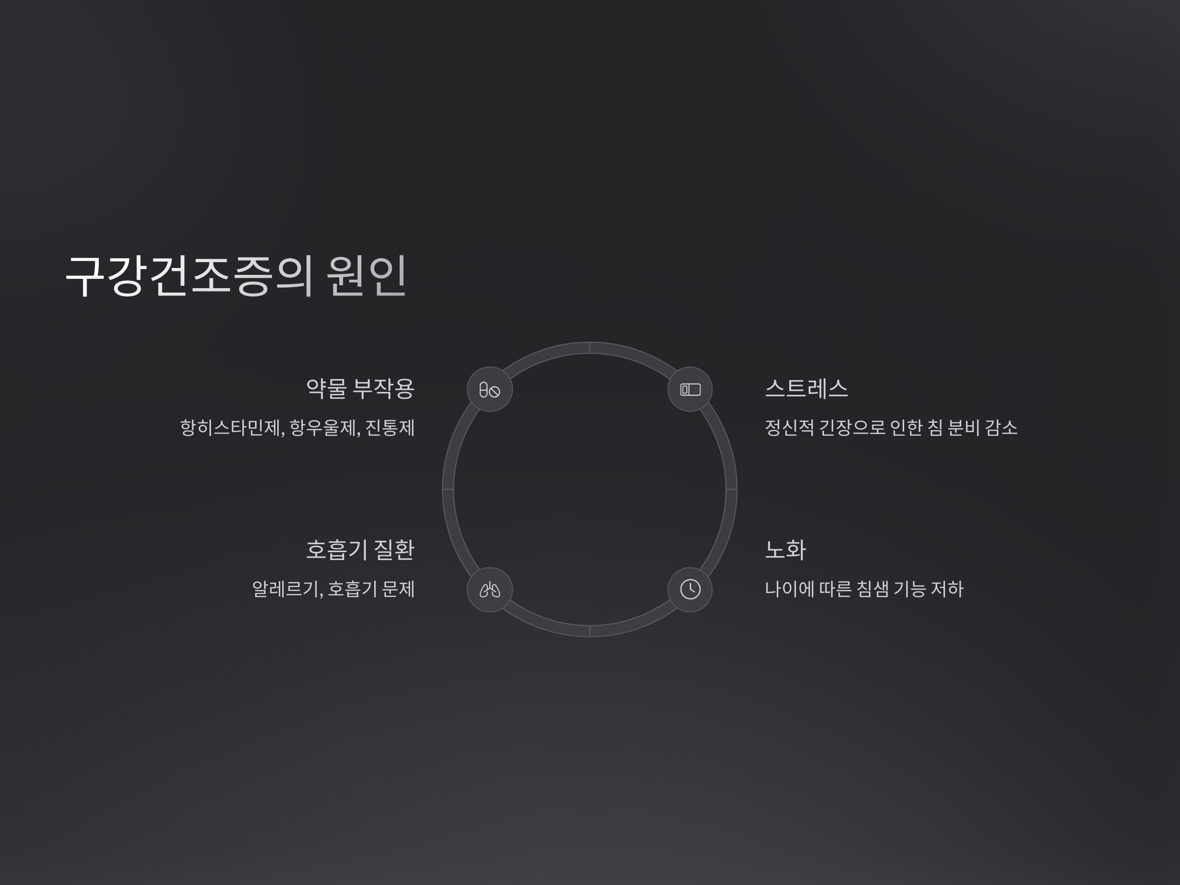 구강건조증은 다양한 원인에 의해 발생할 수 있는 증상입니다. 대표적으로는 입안이 마르고, 침이 충분히 분비되지 않아 불편함을 초래하는 상태를 말합니다. 구강건조증은 주로 스트레스, 약물의 부작용, 나이 등 다양한 이유로 발생할 수 있습니다. 특히, 항히스타민제, 항우울제, 진통제와 같은 약물을 복용하는 경우, 입안이 마를 수 있습니다.