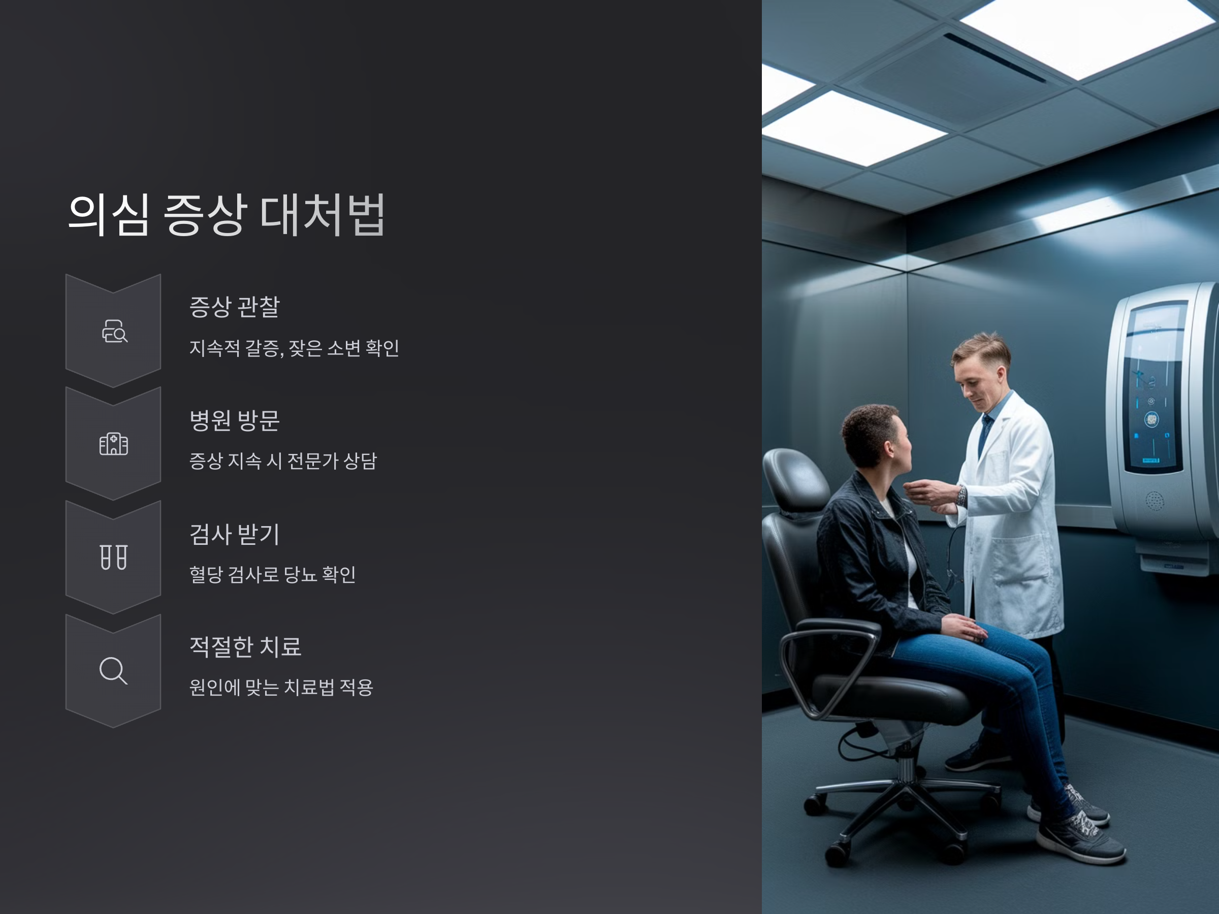 입안이 마르고 갈증이 심할 때는 먼저 그 원인을 정확히 파악하는 것이 중요합니다. 만약 당뇨와 같은 질병이 의심된다면, 혈당 검사를 통해 빠르게 진단을 받아야 합니다. 또한, 적절한 수분 섭취와 함께, 당뇨를 예방하거나 관리할 수 있는 생활 습관을 유지하는 것이 중요합니다. 균형 잡힌 식사와 규칙적인 운동은 혈당 수치를 안정시키는 데 도움을 줍니다.