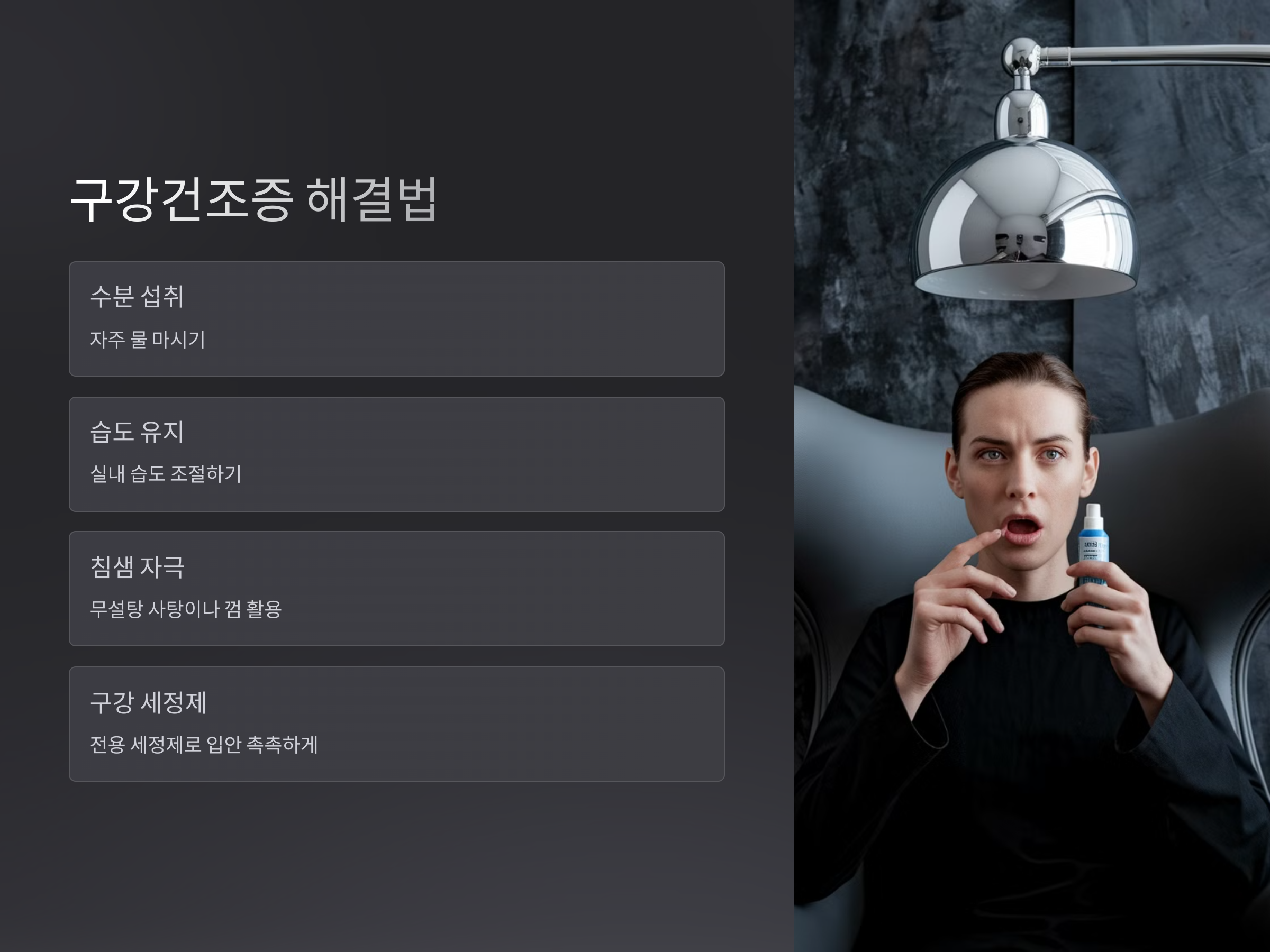 구강건조증의 경우, 입안을 촉촉하게 유지할 수 있는 방법들이 있습니다. 수분 섭취를 자주 하고, 흡입할 수 있는 습도를 유지하는 것이 중요합니다. 또한, 침샘을 자극하는 사탕이나 껌을 활용하거나, 구강 세정제를 사용하는 것도 도움이 될 수 있습니다.