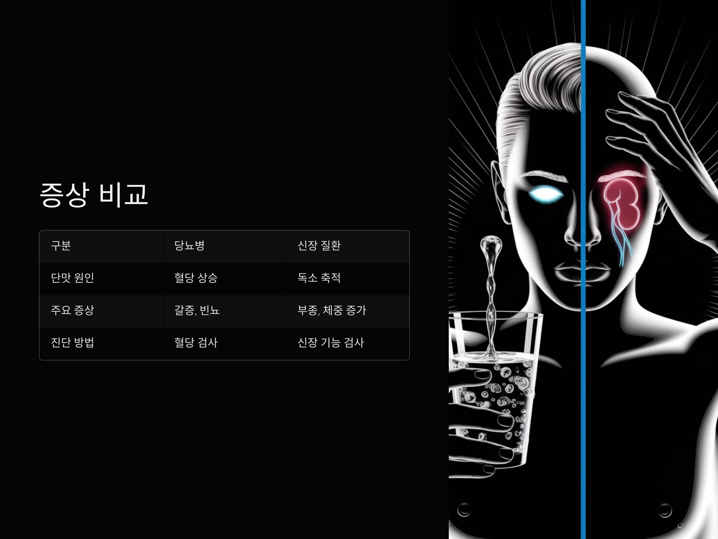 당뇨병 초기 증상과 신장 질환의 초기 증상은 때때로 매우 비슷할 수 있으므로, 각 질환의 특징을 잘 이해하고 정기적인 검사를 통해 건강을 관리하는 것이 최선의 방법입니다.