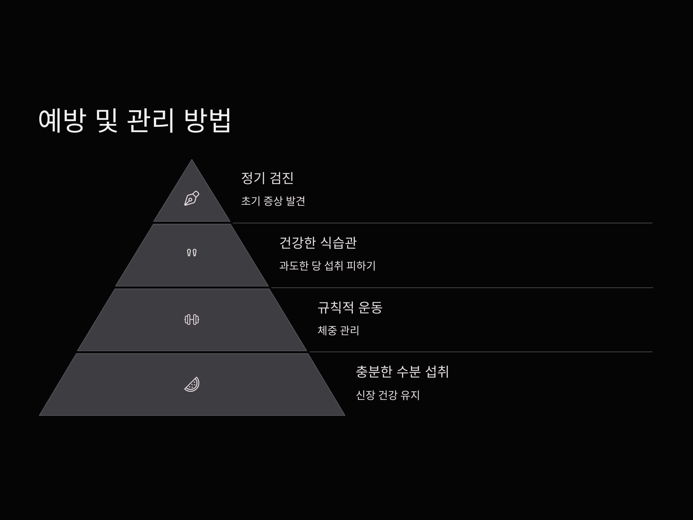 당뇨병과 신장 질환을 예방하는 가장 중요한 방법은 일상적인 건강 관리입니다. 건강한 식습관, 규칙적인 운동, 체중 관리가 그 핵심입니다. 당뇨병을 예방하기 위해서는 과도한 당 섭취를 피하고, 정기적인 혈당 검사를 통해 초기 증상을 발견하는 것이 중요합니다.
