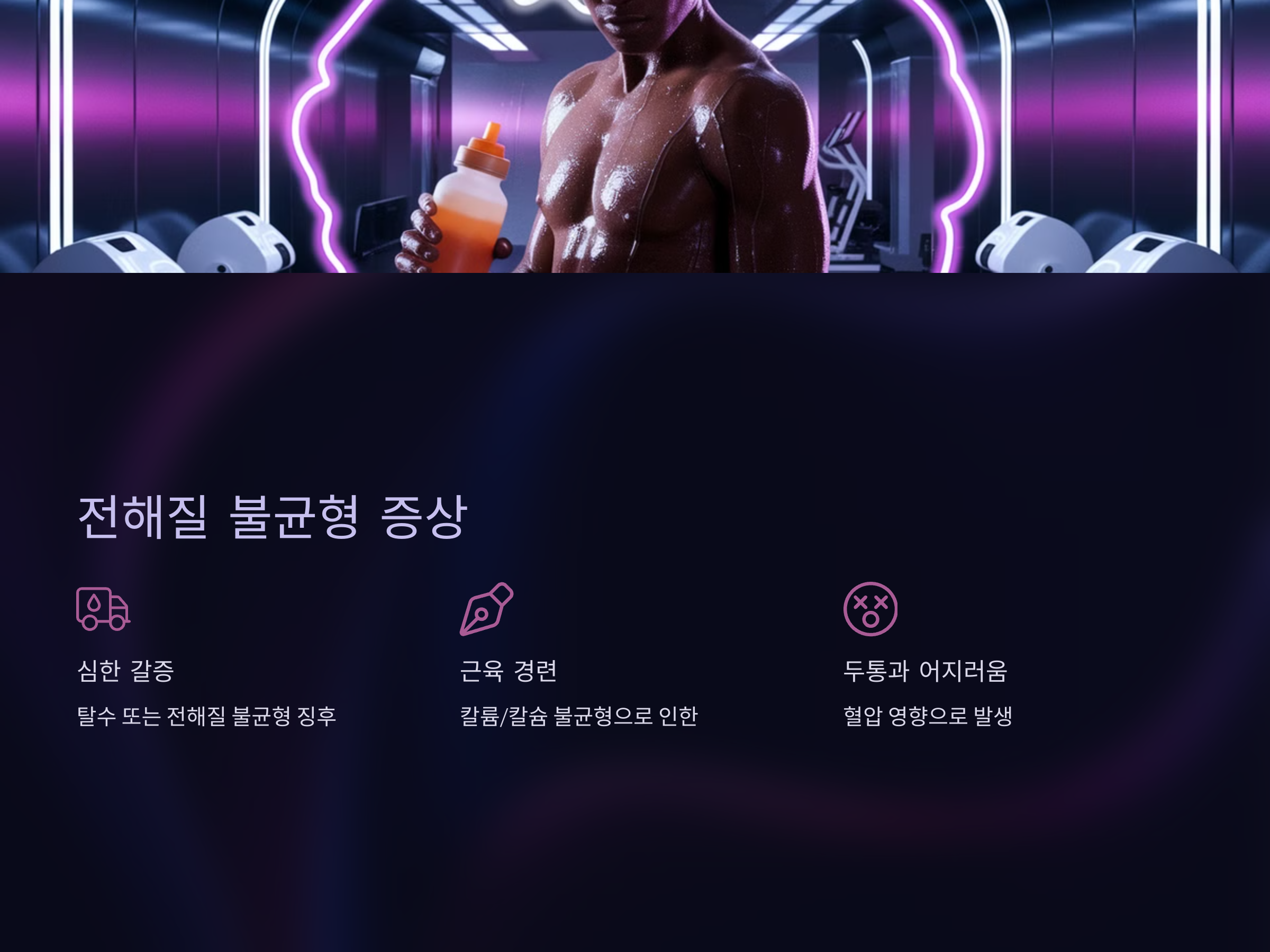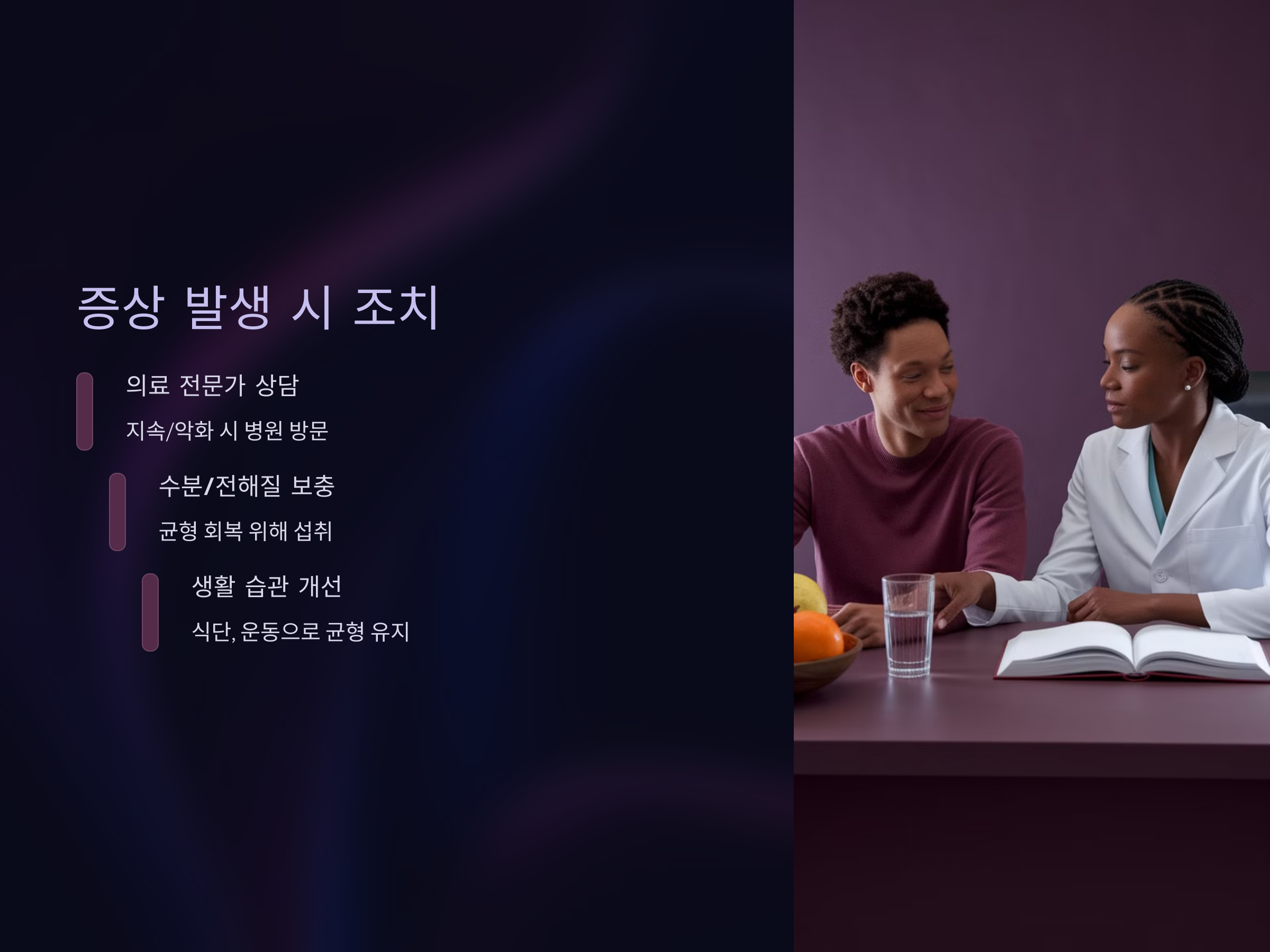 - 수분 및 전해질 보충: 전해질 불균형이 의심될 경우 물과 전해질이 포함된 음료를 섭취하여 균형을 회복하세요.