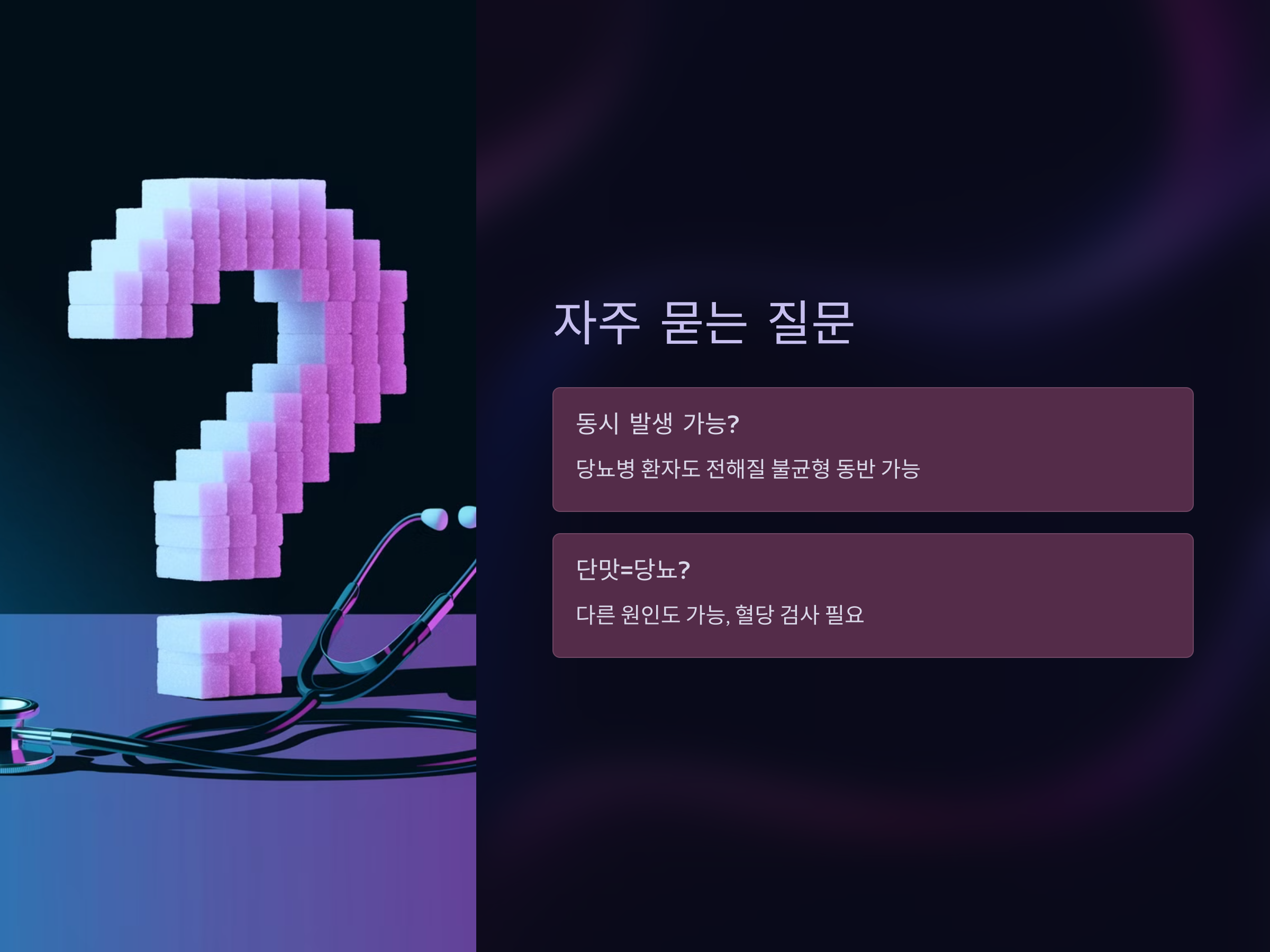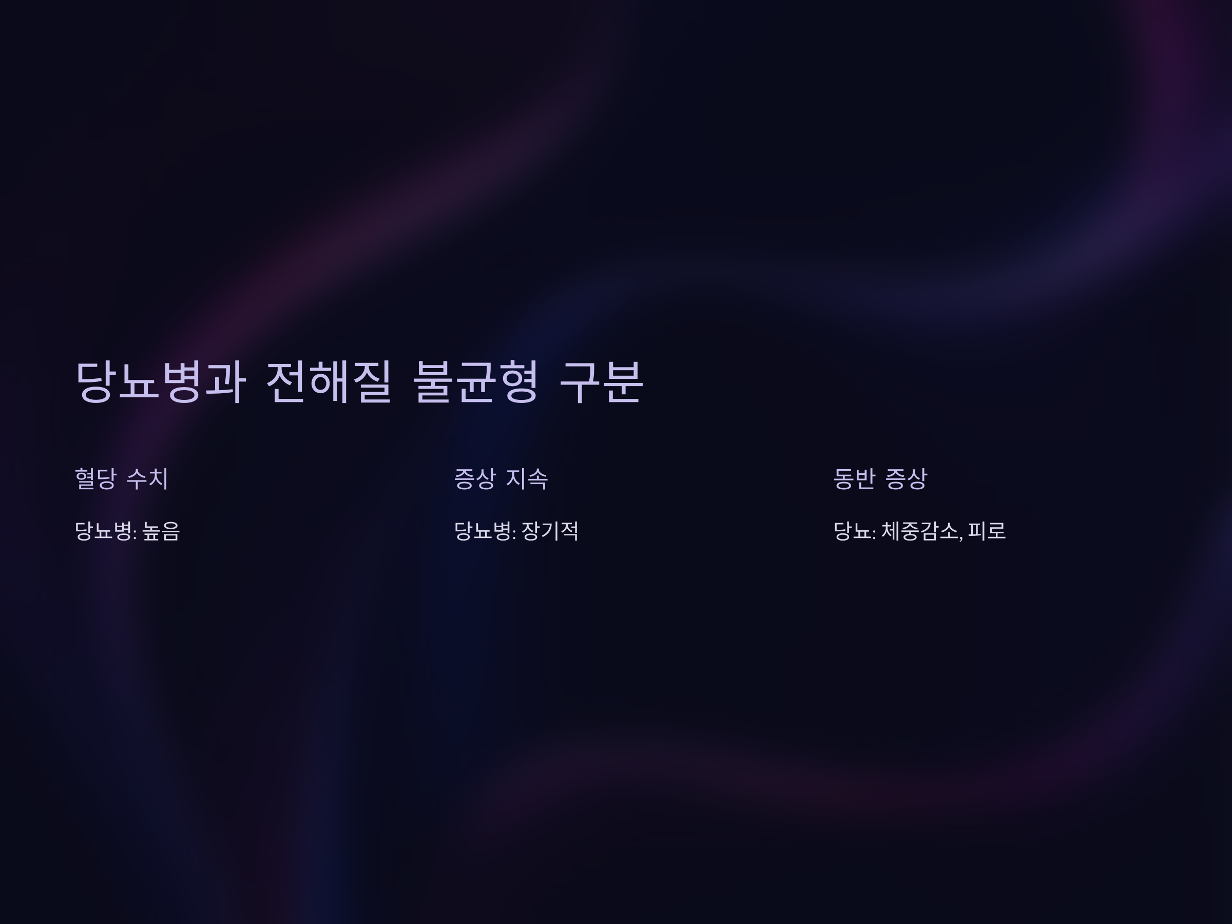 - 동반 증상 차이: 당뇨병 초기에는 체중 감소, 피로감이 동반될 수 있지만 전해질 불균형에서는 근육 경련, 어지러움이 주로 나타납니다.