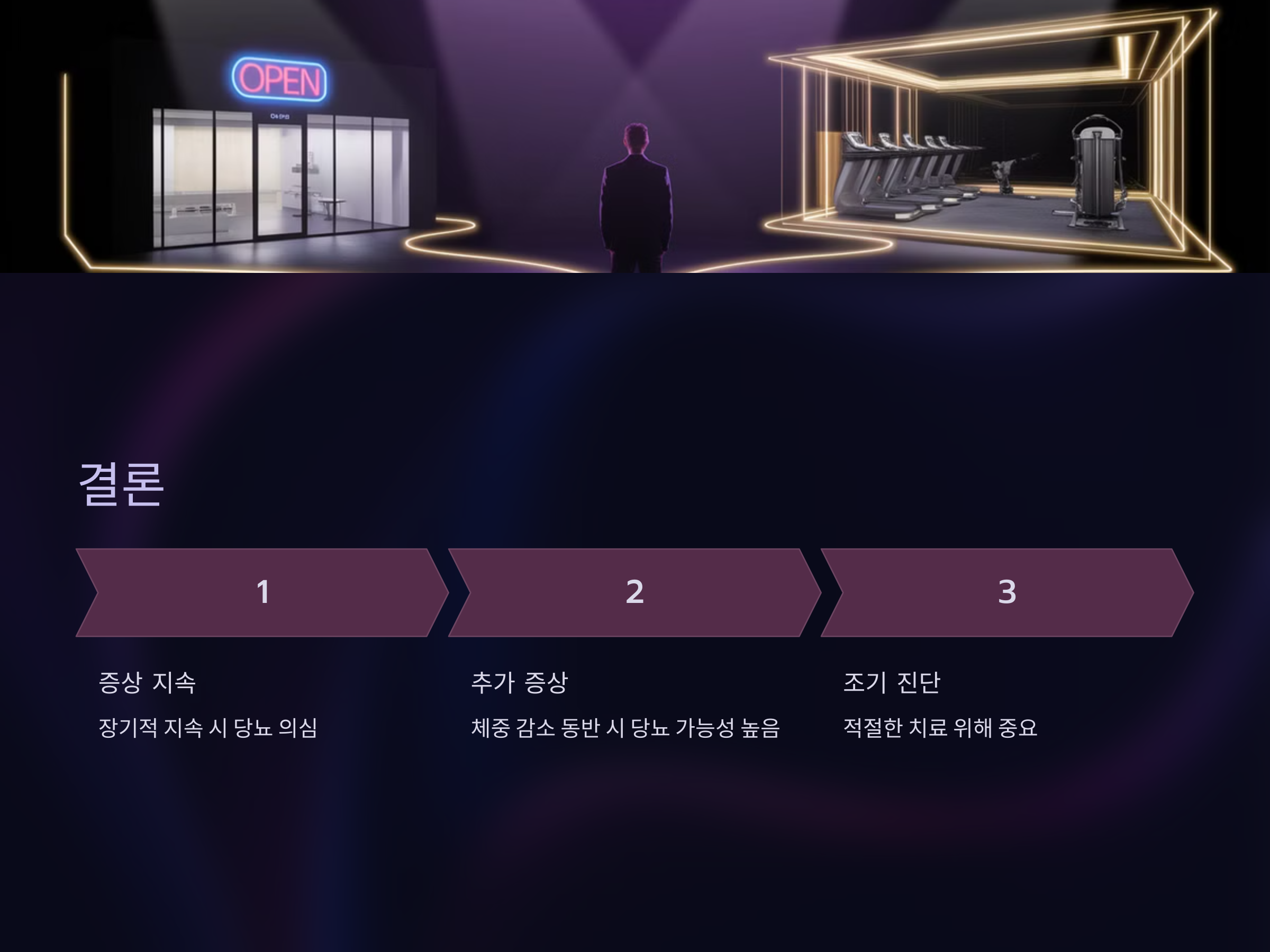 - 갈증 및 잦은 소변: 체내 포도당 농도가 높아지면서 신장이 이를 배출하려고 하기 때문에 잦은 소변과 갈증이 발생합니다.