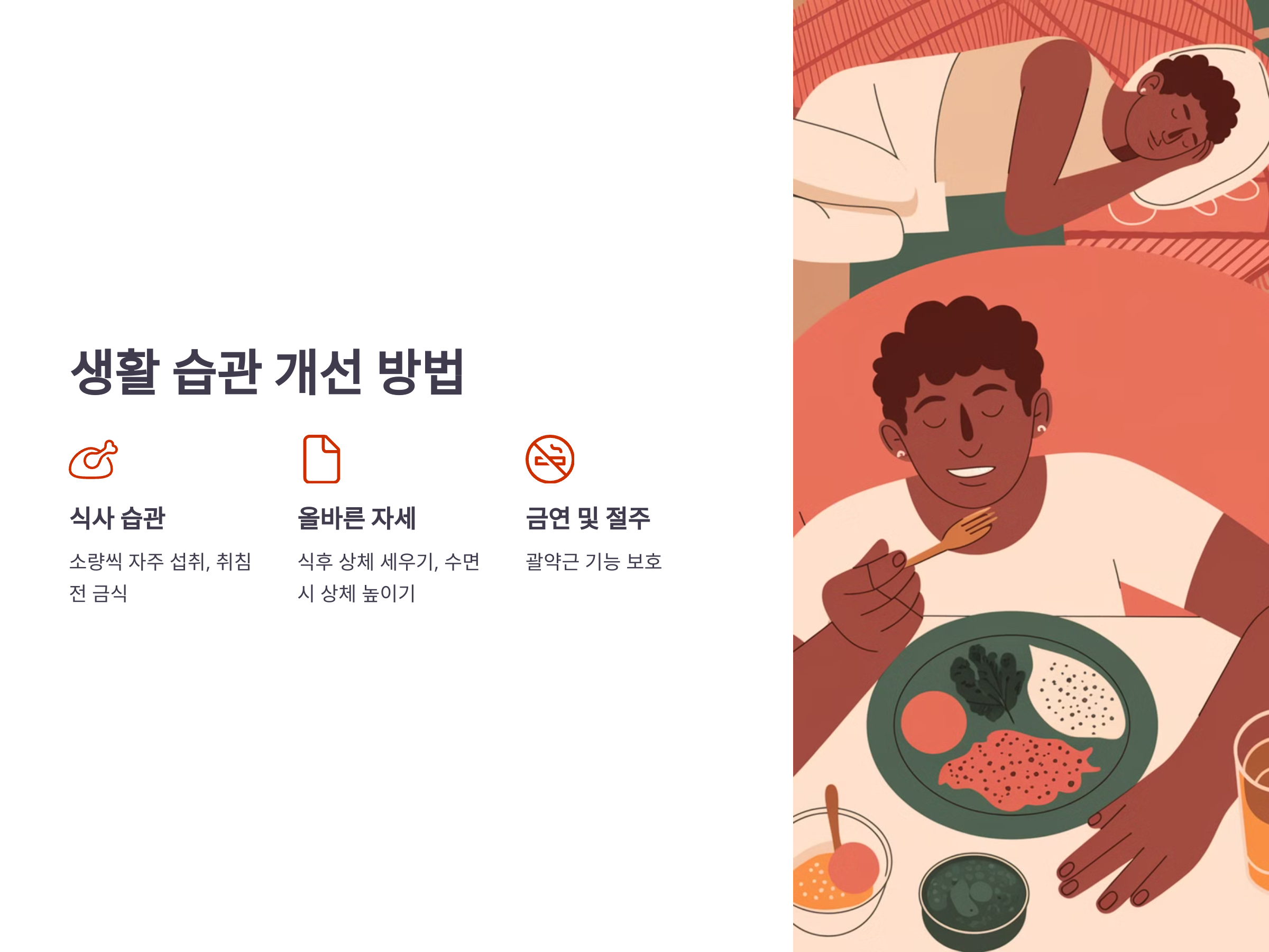 - 식사 후 바로 눕지 않고 상체를 세운 자세를 유지합니다.
