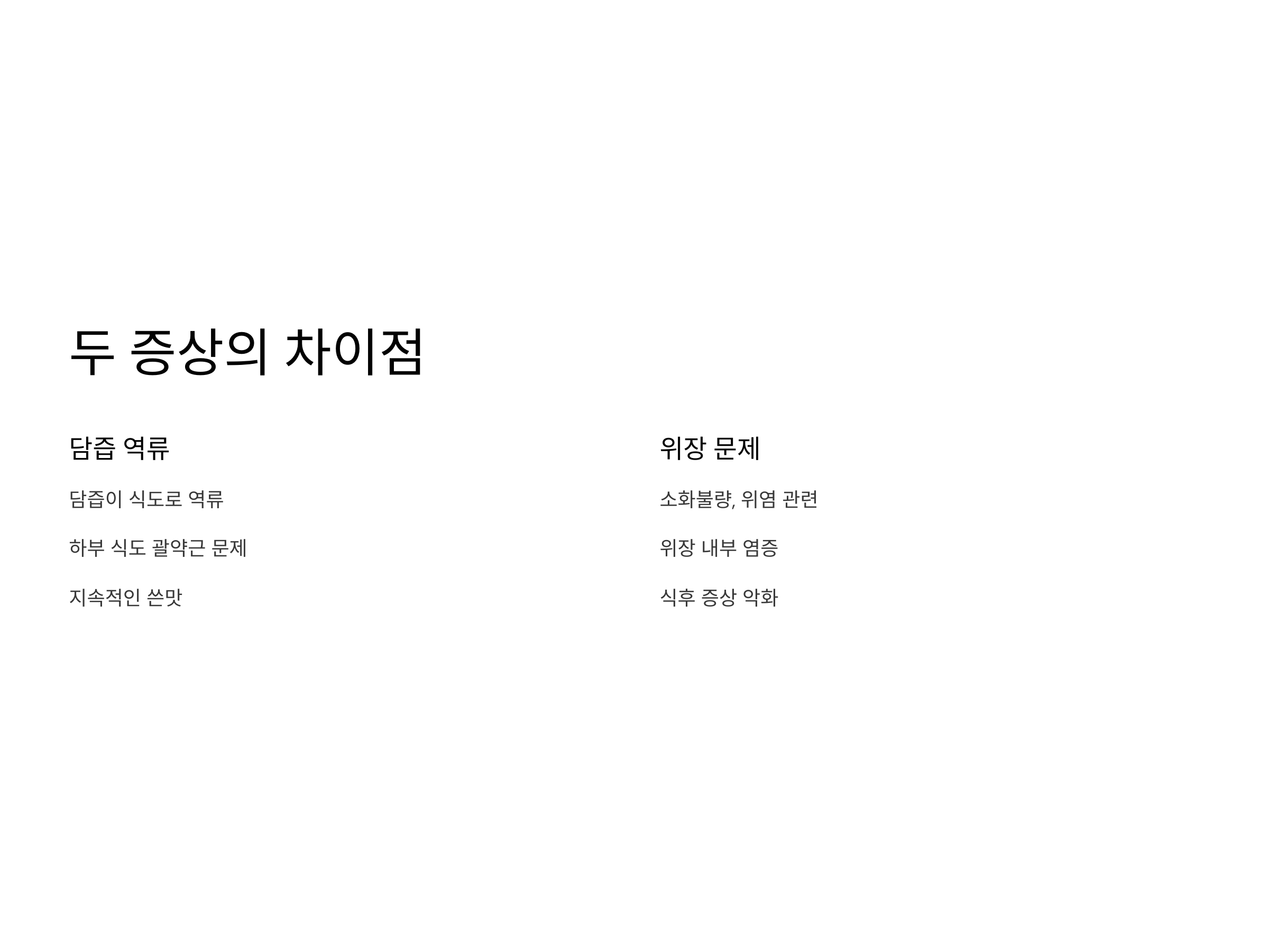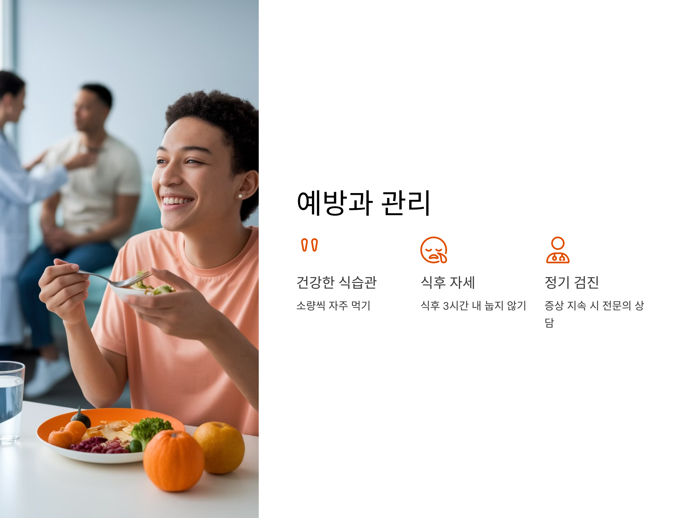 - 속쓰림, 가슴 통증, 구토 등의 증상이 동반된다.