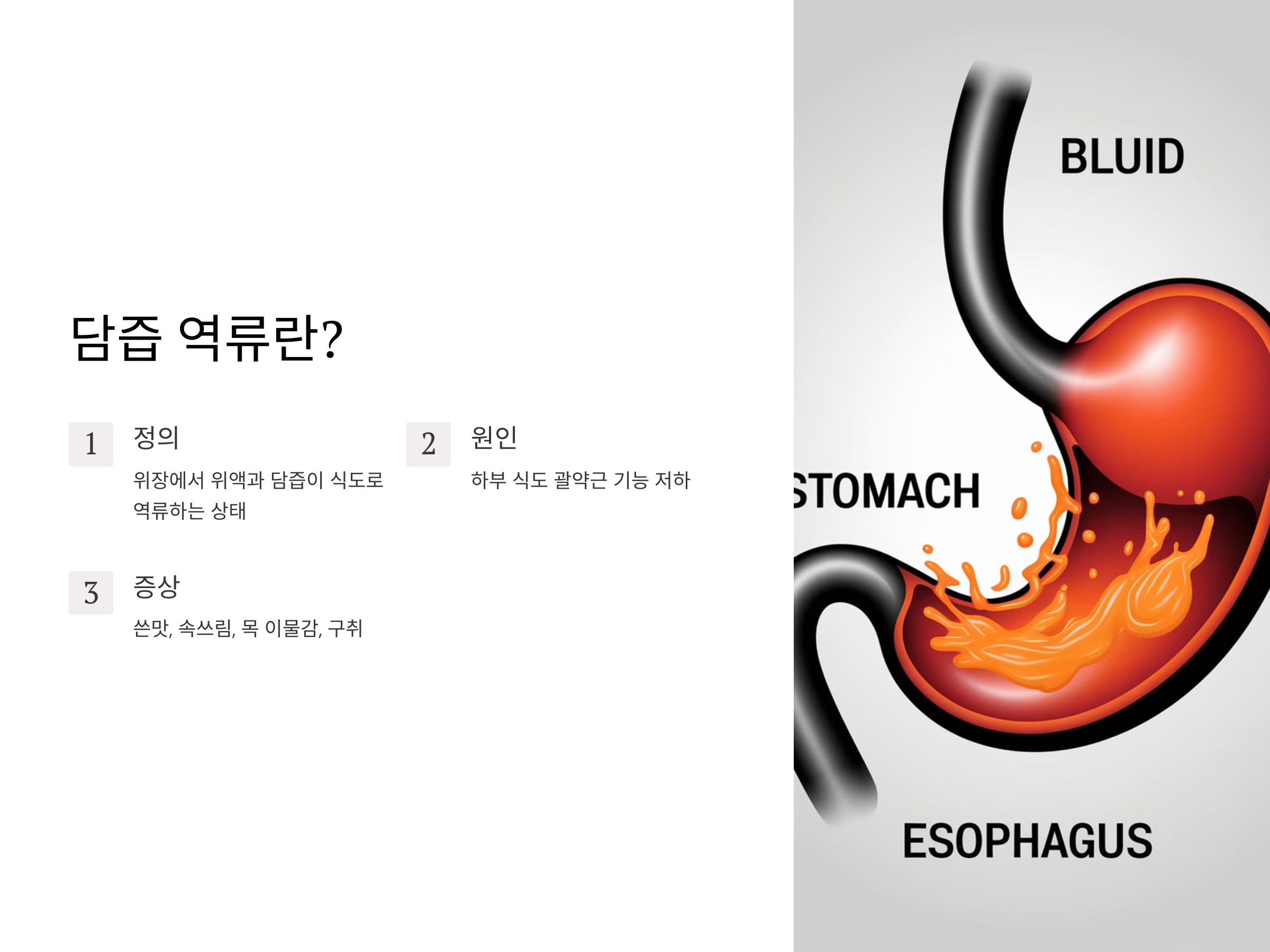 담즙 역류의 주요 원인 중 하나는 위장의 하부 식도 괄약근이 제대로 닫히지 않아서 발생합니다. 이 괄약근이 제대로 기능하지 않으면 담즙과 위액이 위에서 식도로 역류할 수 있습니다. 이로 인해 위장에 염증이 생기고, 시간이 지나면 위염, 역류성 식도염 등으로 이어질 수 있습니다. 담즙 역류가 지속되면 구취가 심해지고, 입에서 쓴맛이 나는 증상이 반복될 수 있습니다.