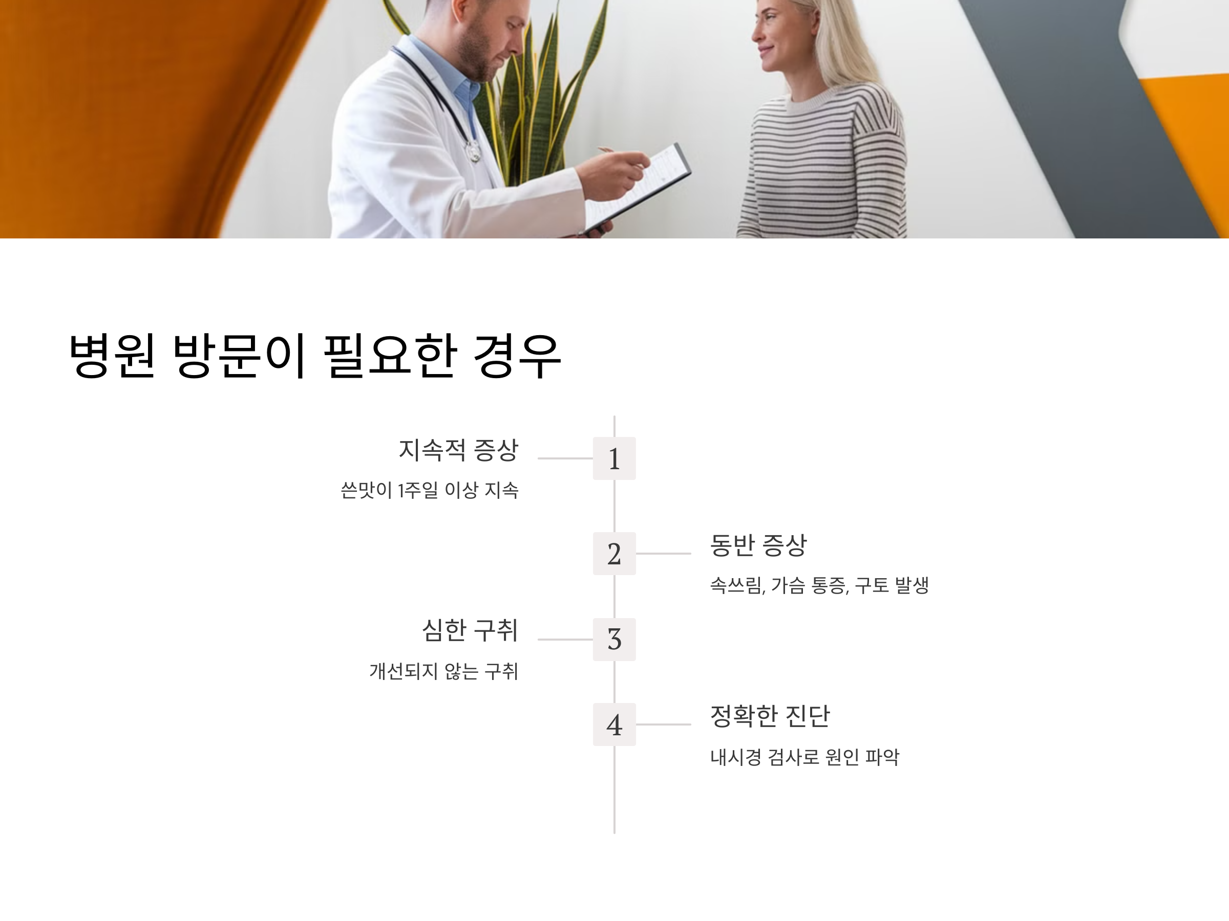 입에서 쓴맛이나 구취가 단기적으로 발생하는 경우라면, 일시적인 문제일 수 있습니다. 하지만 이러한 증상이 지속적으로 발생하거나, 다른 증상들과 함께 나타날 경우에는 반드시 병원을 방문하는 것이 좋습니다. 특히 담즙 역류나 위장 문제가 의심되는 경우에는 내시경 검사 등을 통해 정확한 원인을 파악해야 합니다. 의사와 상담 후 적절한 치료를 받는 것이 중요합니다.