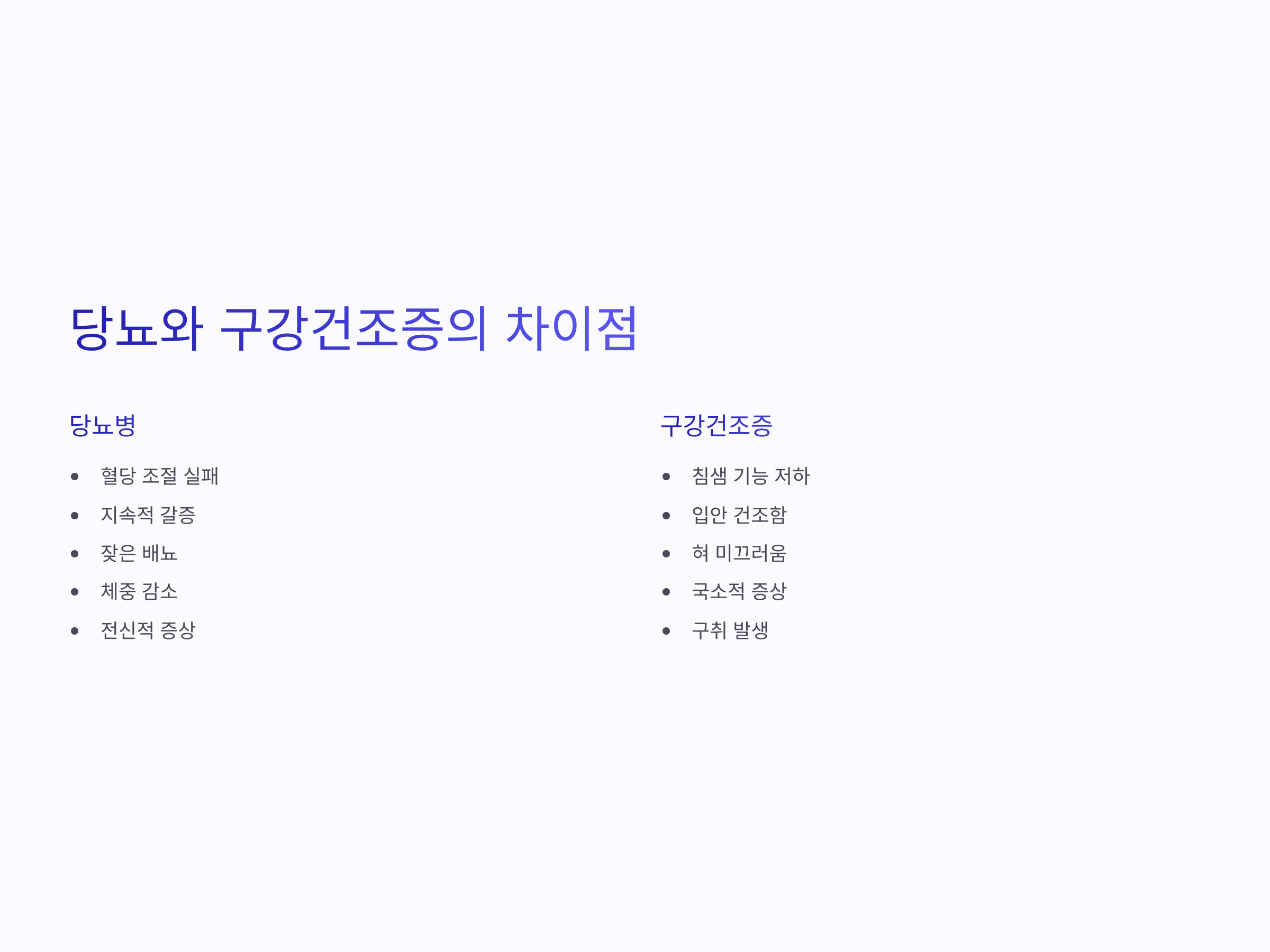 당뇨병과 구강건조증은 입 마름이라는 공통된 증상을 가지고 있지만, 그 원인과 특징에서 차이가 있습니다. 당뇨병은 혈당 조절 실패로 인해 체내 수분이 부족해지면서 입이 마르고 갈증이 심해지는 질환입니다. 반면, 구강건조증은 입 안의 침이 부족하거나 침샘 기능이 저하되어 발생하는 증상으로, 체내 수분 부족과는 다소 다른 원인에서 발생합니다.