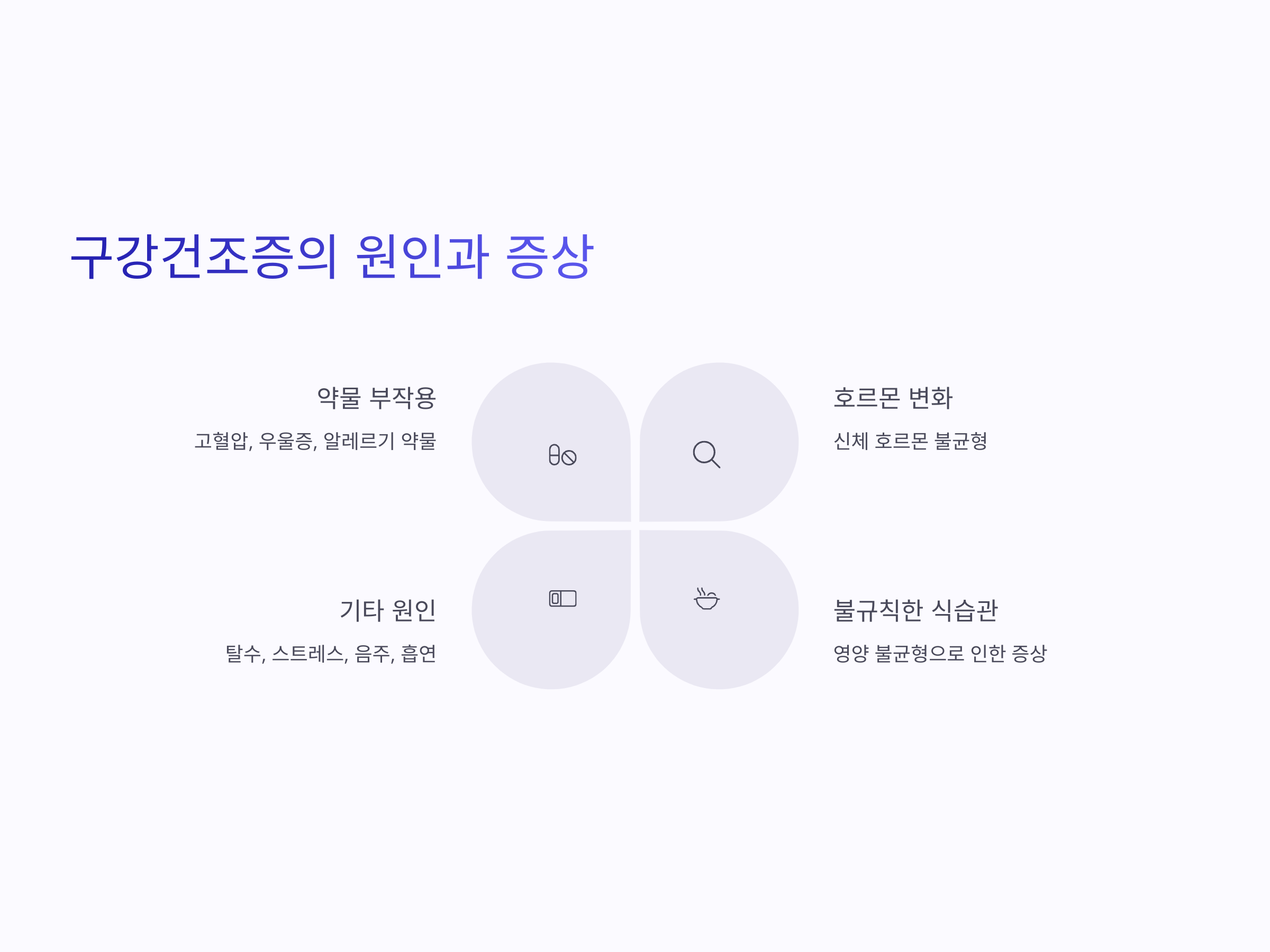 구강건조증은 입 안의 침이 부족하여 입안이 마르는 증상입니다. 이는 여러 가지 원인에 의해 발생할 수 있으며, 가장 흔한 원인 중 하나는 약물 부작용입니다. 고혈압, 우울증, 알레르기 약물 등 여러 약물이 구강건조증을 유발할 수 있습니다. 또한, 호르몬 변화나 불규칙한 식습관도 구강건조증을 초래할 수 있습니다. 구강건조증은 당뇨병 초기 증상과 비슷한 증상을 보이지만, 당뇨병과 달리 갈증이 그리 강하게 느껴지지 않으며, 구강 내 점막의 건조함과 혀의 미끄러움이 특징입니다.