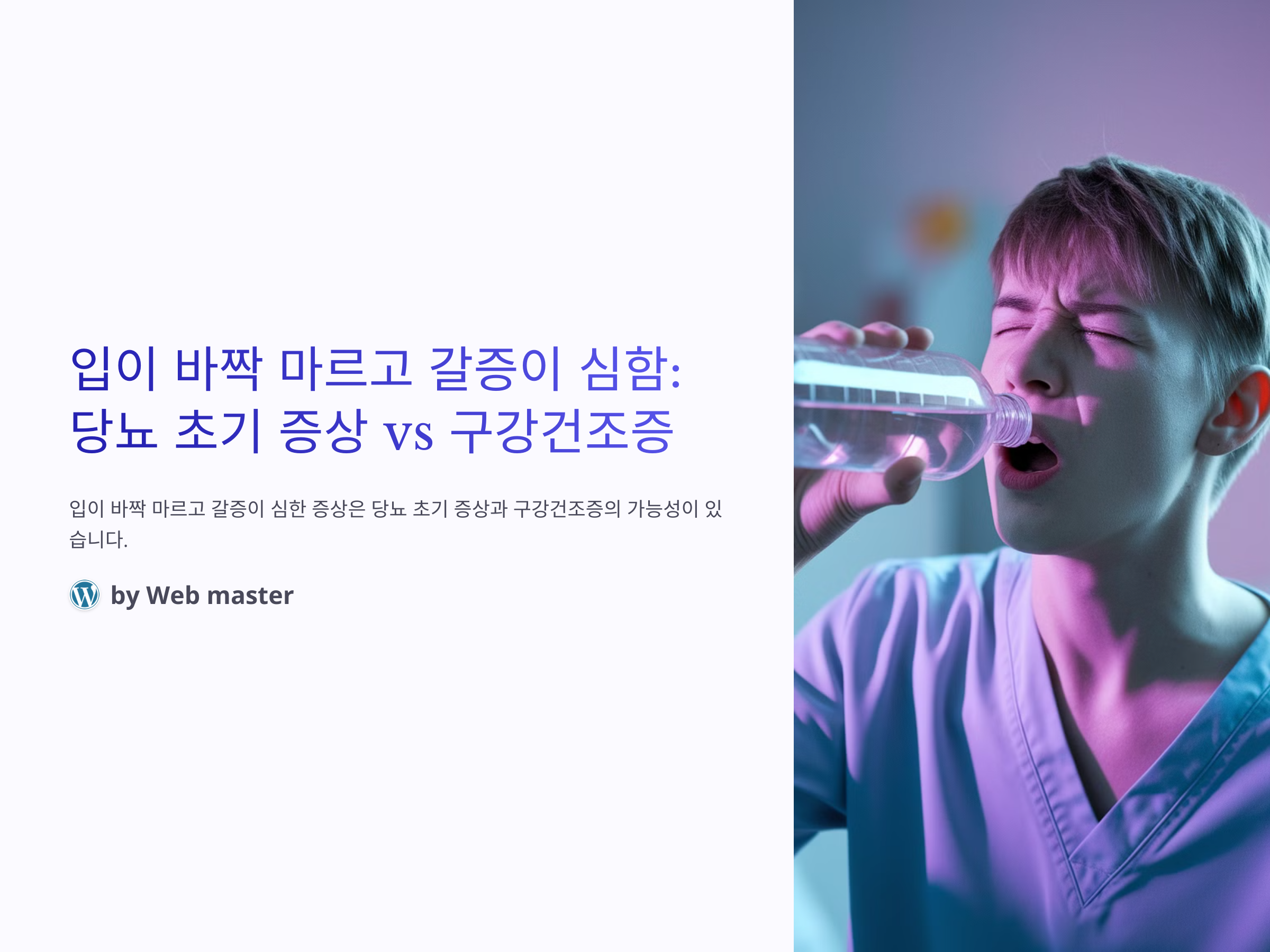 입이 바짝 마르고 갈증이 심한 증상은 많은 사람들이 경험할 수 있는 불편한 증상입니다. 그러나 이 증상이 나타날 때, 그 원인을 정확히 파악하는 것은 매우 중요합니다. 특히 당뇨 초기 증상과 구강건조증은 비슷한 증상을 보일 수 있어 혼동하기 쉽습니다. 두 가지 증상은 각각 다른 원인에 의해 발생하므로, 그 차이점과 대처 방법에 대해 이해하는 것이 중요합니다.