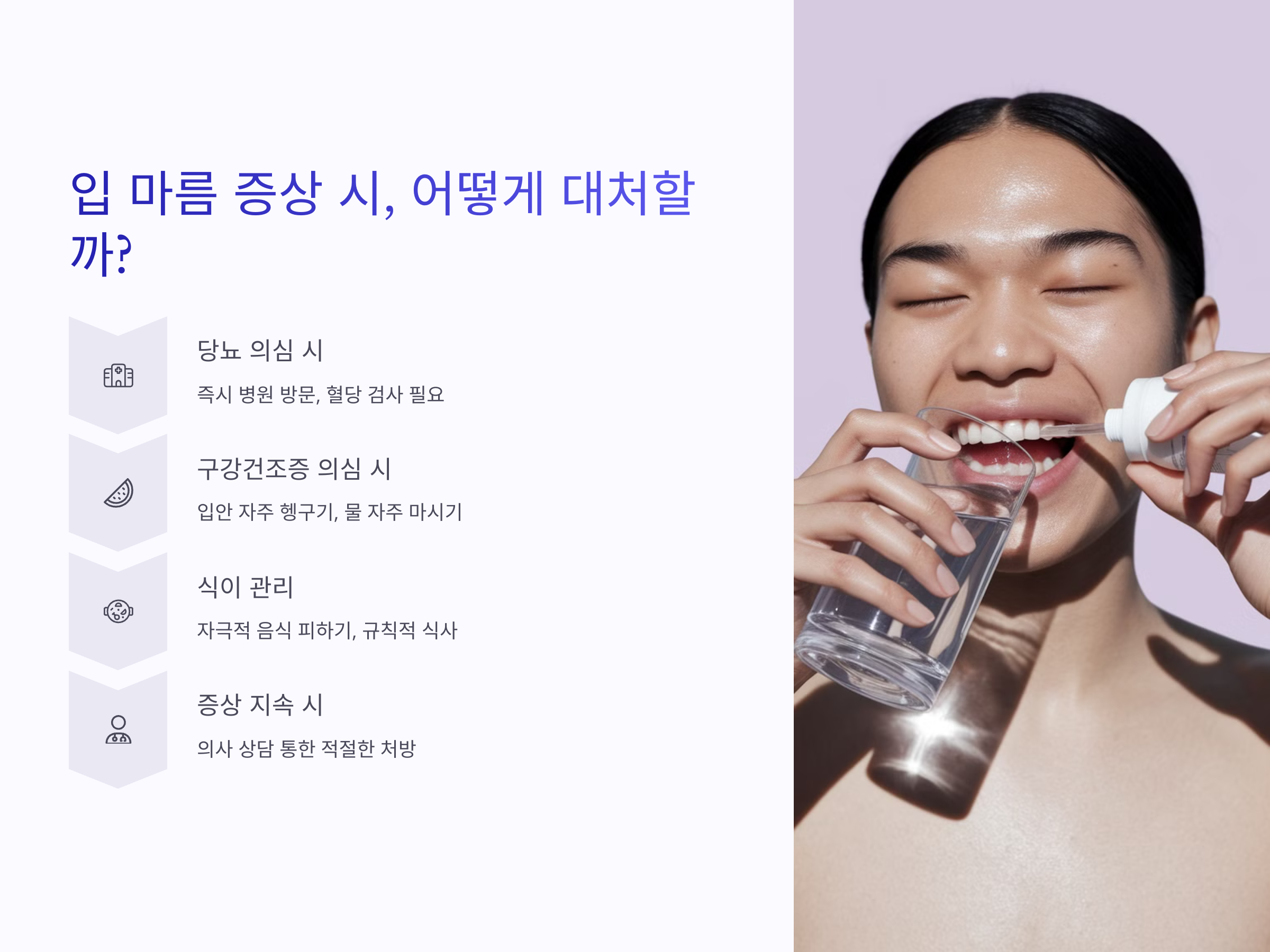 당뇨병이 의심될 경우, 빠른 시일 내에 혈당을 측정하고, 필요하다면 당뇨병 관련 검사를 통해 적절한 치료를 받는 것이 중요합니다. 구강건조증이 의심될 경우, 원인에 맞는 치료와 관리법을 통해 증상을 완화할 수 있습니다. 전문가와의 상담을 통해 최선의 치료 방법을 찾는 것이 중요합니다.