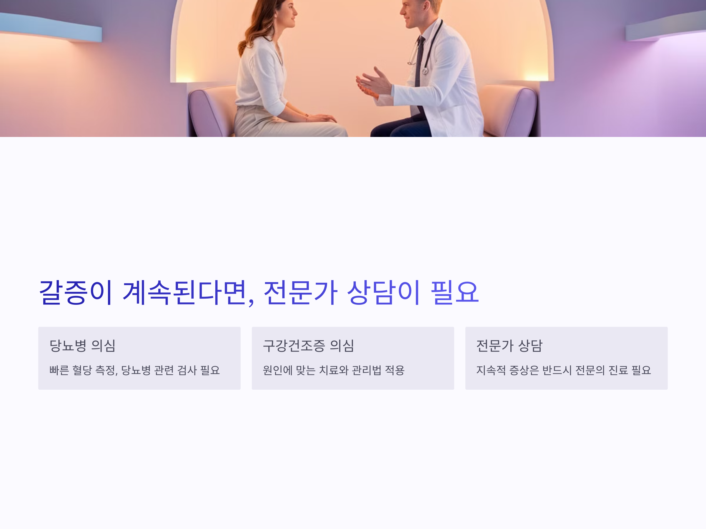 입 마름과 갈증이 지속된다면, 그 원인을 정확히 파악하기 위해 전문가의 상담을 받는 것이 필수입니다. 당뇨병은 조기 발견 시 관리가 가능하지만, 치료하지 않으면 심각한 합병증을 초래할 수 있습니다. 구강건조증 역시 지속될 경우 구강 건강에 큰 영향을 미칠 수 있기 때문에, 증상이 개선되지 않거나 점점 심해진다면 반드시 전문가의 진료를 받는 것이 중요합니다.