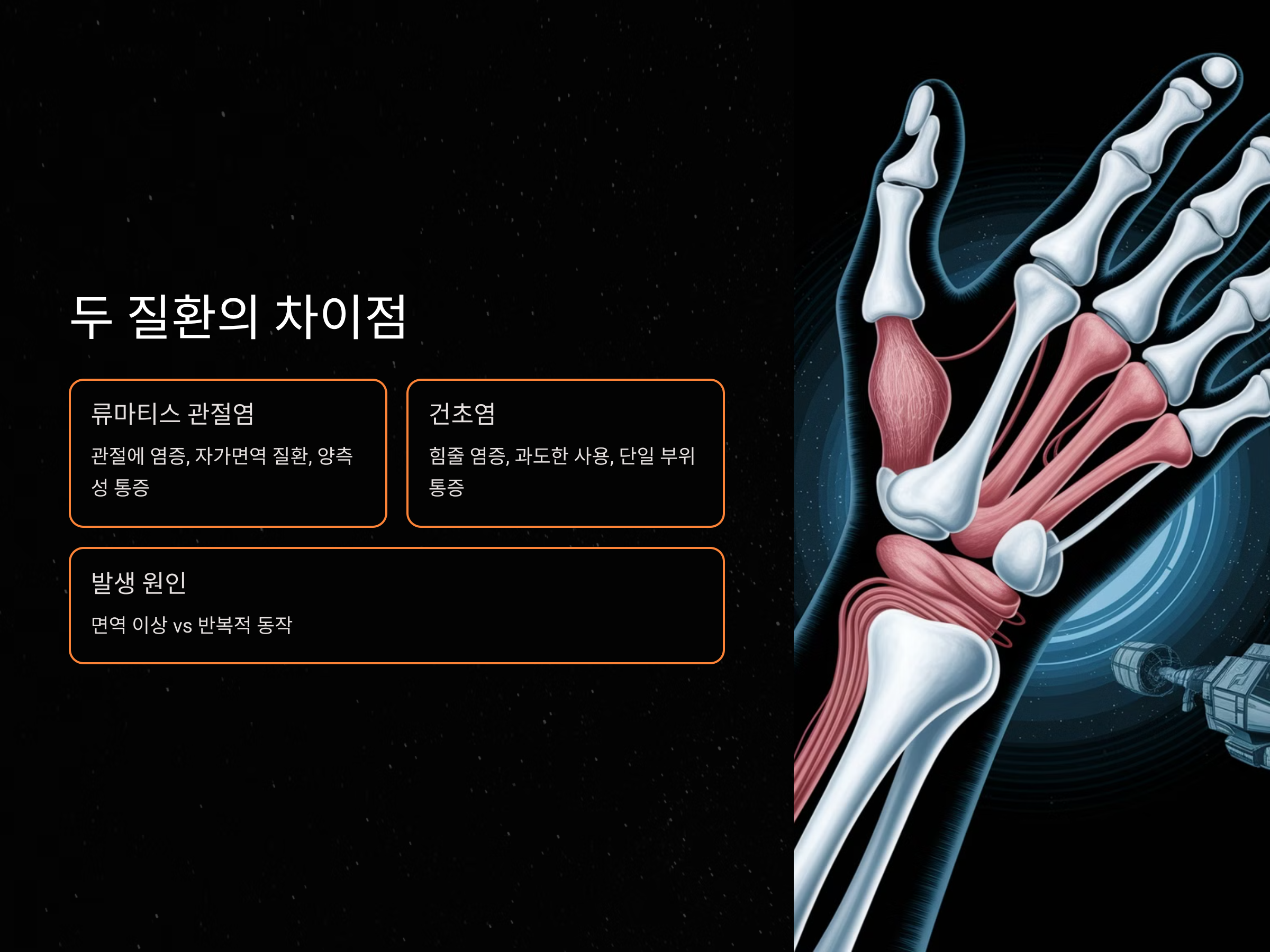 류마티스 관절염과 건초염은 모두 손목에 통증을 일으킬 수 있지만, 그 원인과 증상에서 차이가 있습니다. 두 질환의 가장 큰 차이점은 염증이 발생하는 부위와 염증의 원인입니다.