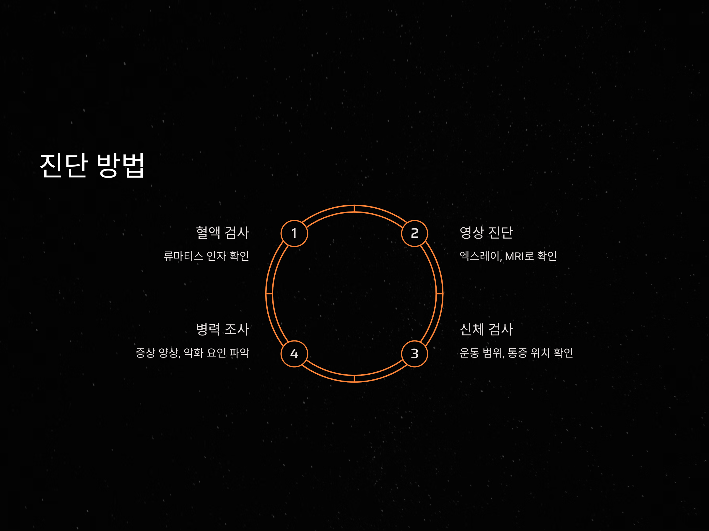 - 류마티스 관절염: 혈액 검사와 엑스레이 검사 등을 통해 진단할 수 있습니다. 혈액 검사에서는 류마티스 인자가 양성으로 나타날 수 있으며, 엑스레이에서는 관절 손상의 징후를 확인할 수 있습니다.