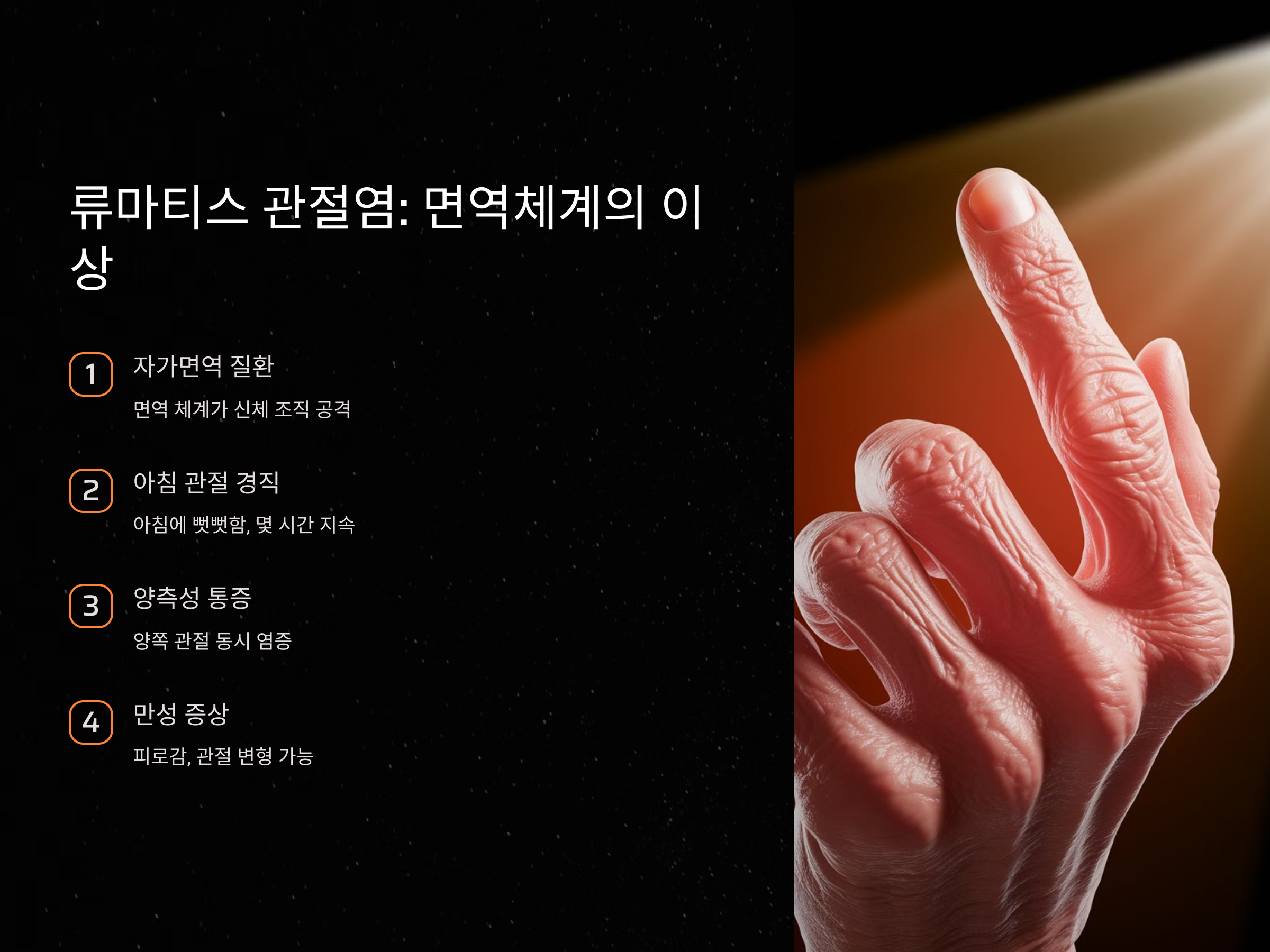 류마티스 관절염(RA)은 자가면역 질환으로, 면역 체계가 신체의 정상적인 조직을 공격하여 염증을 일으키는 질환입니다. 이 질환은 주로 손목, 무릎, 손가락과 같은 작은 관절에서 염증을 일으키며, 특히 아침에 일어나면 관절이 뻣뻣하게 굳고 통증이 심해지는 특징이 있습니다.