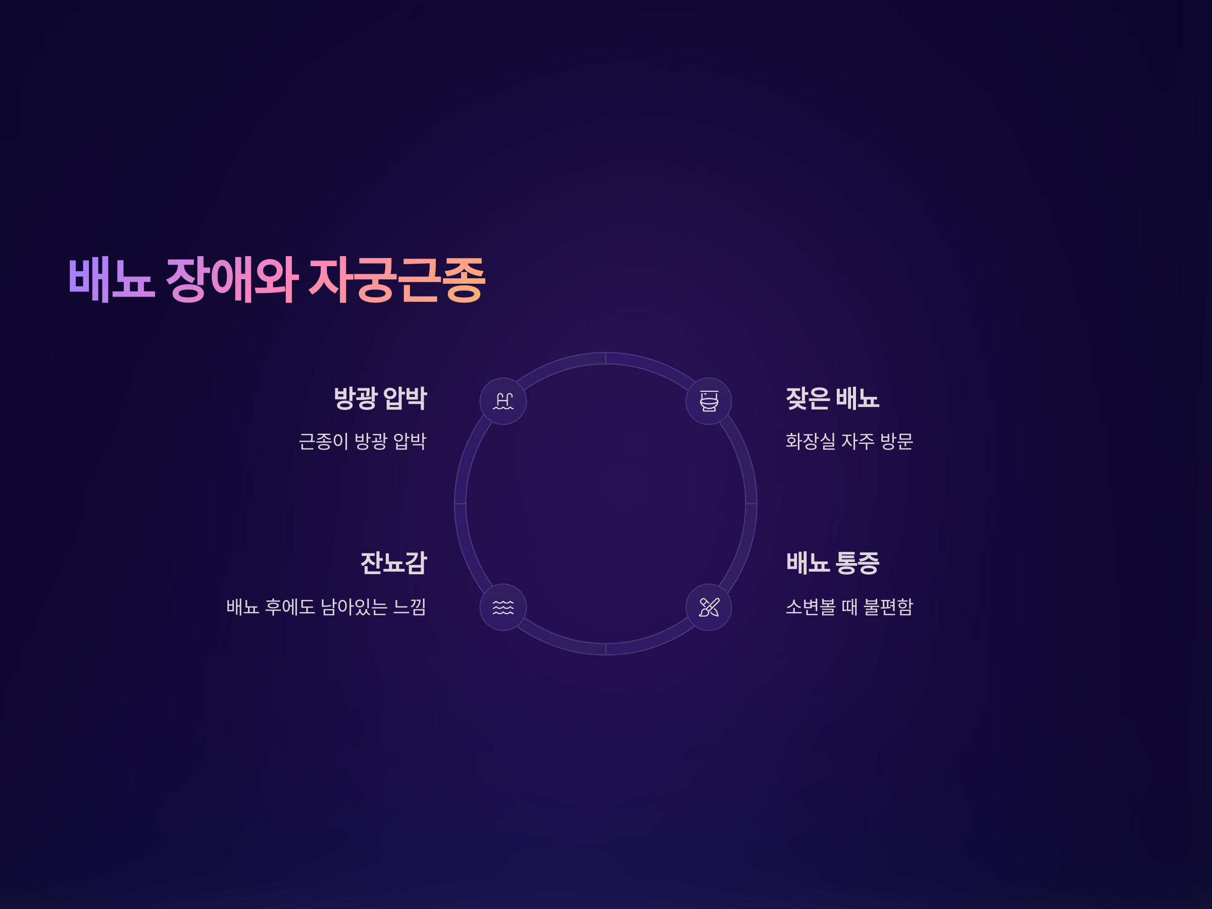 배뇨 장애는 자궁근종으로 인해 발생할 수 있는 또 다른 주요 증상입니다. 자궁근종이 자궁의 크기나 모양을 변화시키면서 주변 장기에 압력을 가할 수 있기 때문에, 특히 방광에 압력이 가해져 배뇨 문제가 발생할 수 있습니다. 자궁근종이 크고 자궁 앞쪽에 위치할 경우, 배뇨가 빈번해지거나 배뇨 후에도 잔여감이 느껴지는 경우가 있습니다.