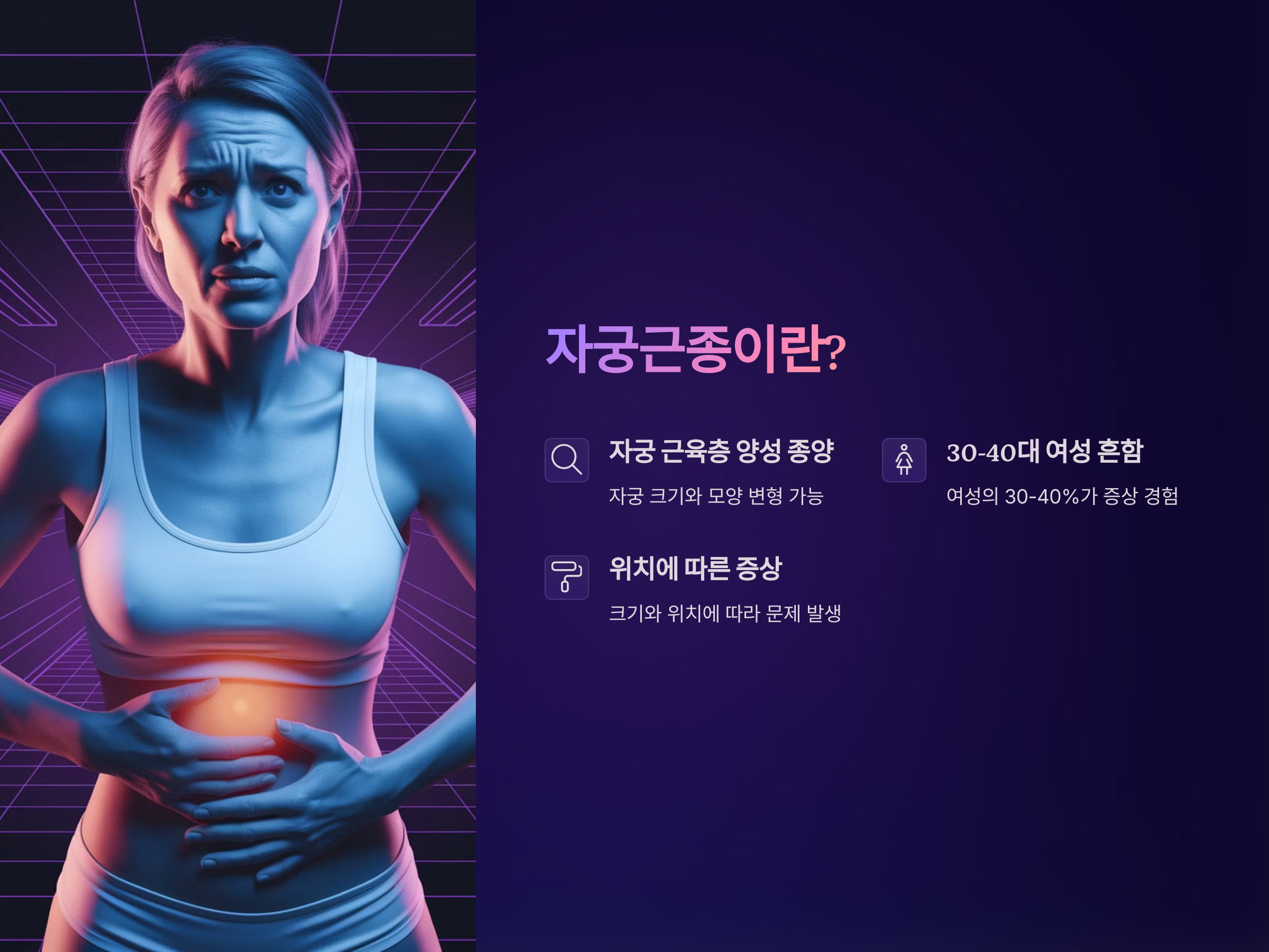 자궁근종은 자궁 근육층에서 발생하는 양성 종양으로, 자궁의 크기나 모양을 변형시킬 수 있습니다. 자궁근종은 자궁의 내벽인 자궁내막이 아닌 근육층에서 자라기 때문에, 그 성질은 근육에 가까운 조직으로 이루어져 있습니다. 이들은 보통 비정상적인 증상을 일으키지 않지만, 크기가 커지거나 위치에 따라 여러 가지 문제를 발생시킬 수 있습니다. 자궁근종은 30대 후반에서 40대 초반의 여성들 사이에서 가장 흔하게 발견되며, 자궁근종이 있는 여성의 약 30~40%가 생리 과다, 배뇨 장애 등의 증상을 경험할 수 있습니다.