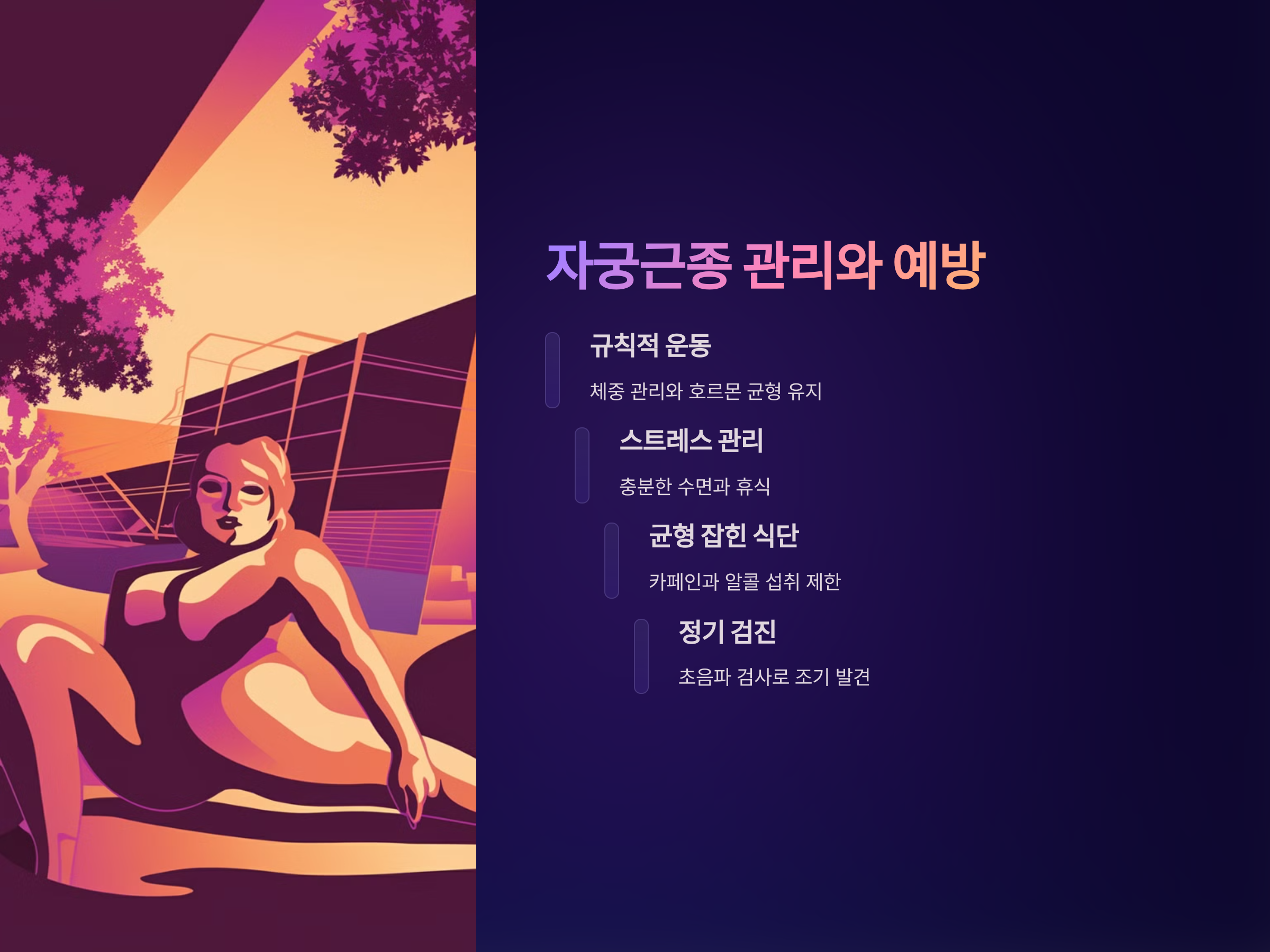 자궁근종은 종종 재발할 수 있기 때문에 관리가 중요합니다. 생활 습관의 변화와 정기적인 검진을 통해 자궁근종을 예방하거나 증상을 완화할 수 있습니다. 자궁근종의 예방을 위한 몇 가지 팁은 다음과 같습니다: