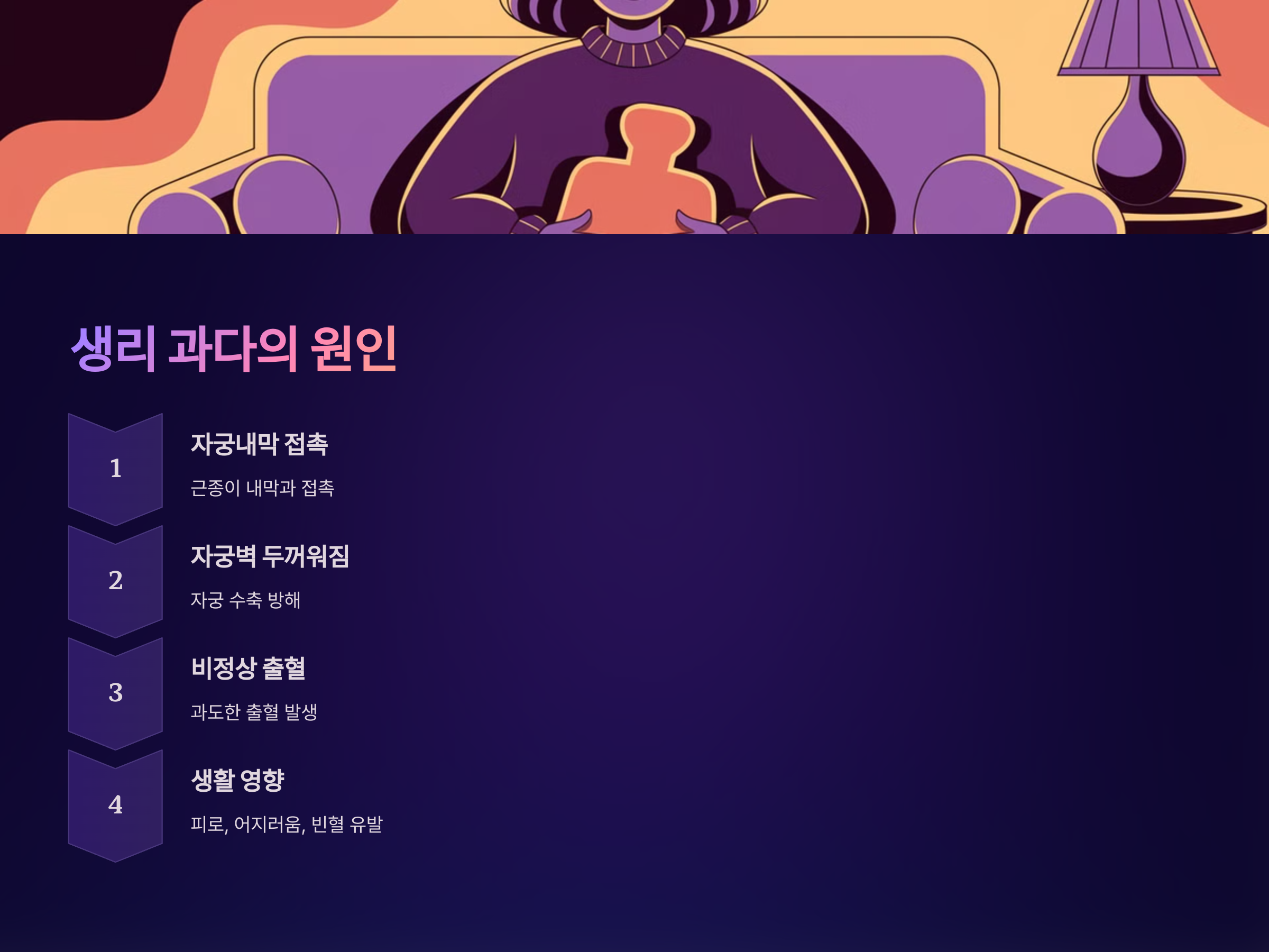 자궁근종이 생리 과다를 유발하는 주요 원인은 종양이 자궁 내에서 출혈을 일으킬 수 있기 때문입니다. 자궁근종이 자궁 내막에 가까운 위치에 있거나, 자궁벽을 두껍게 만들어 자궁의 수축을 방해하면 생리 시 과다 출혈이 발생할 수 있습니다.