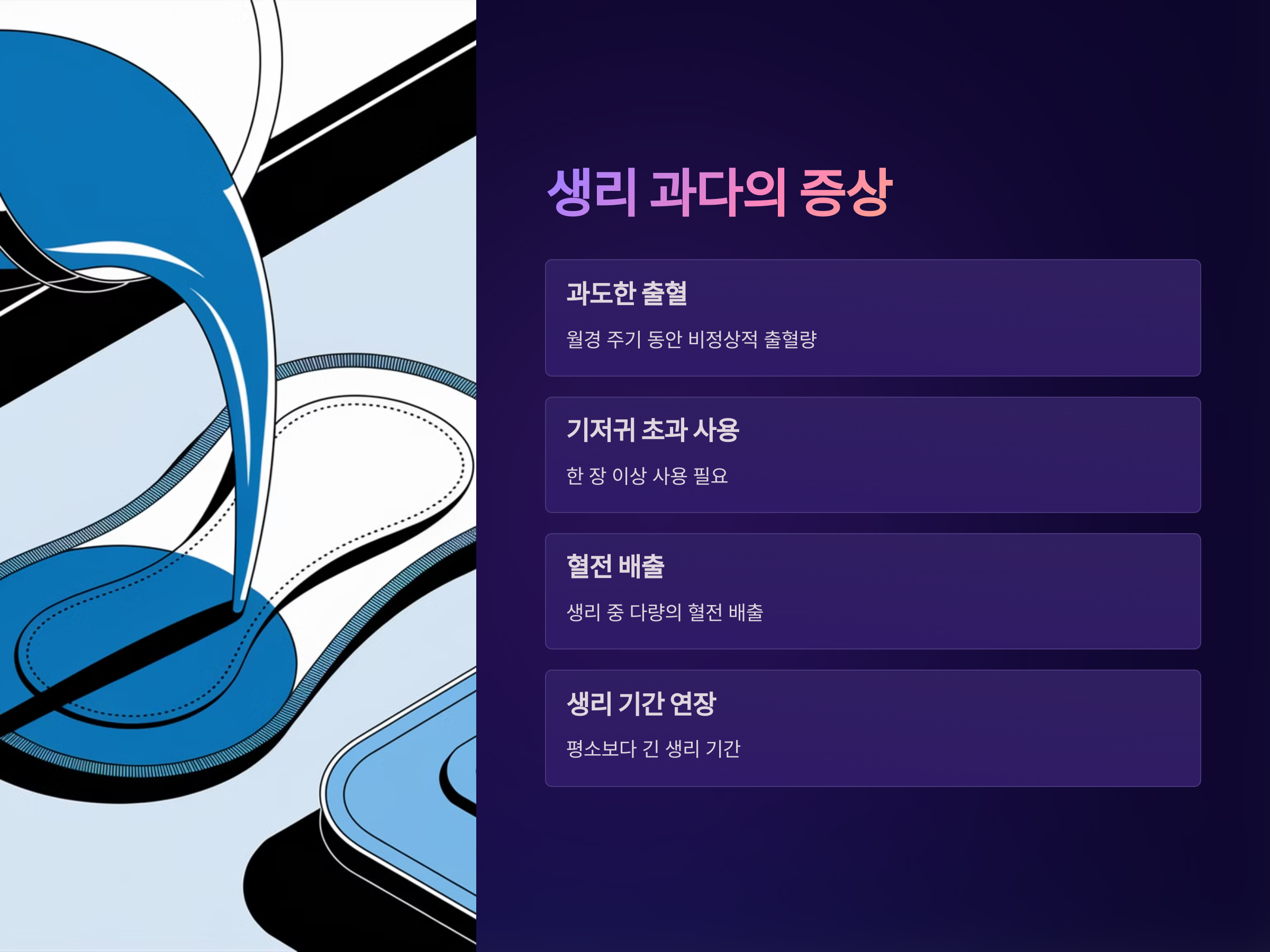 - 생리 기간 동안 기저귀 한 장을 초과하는 양의 출혈