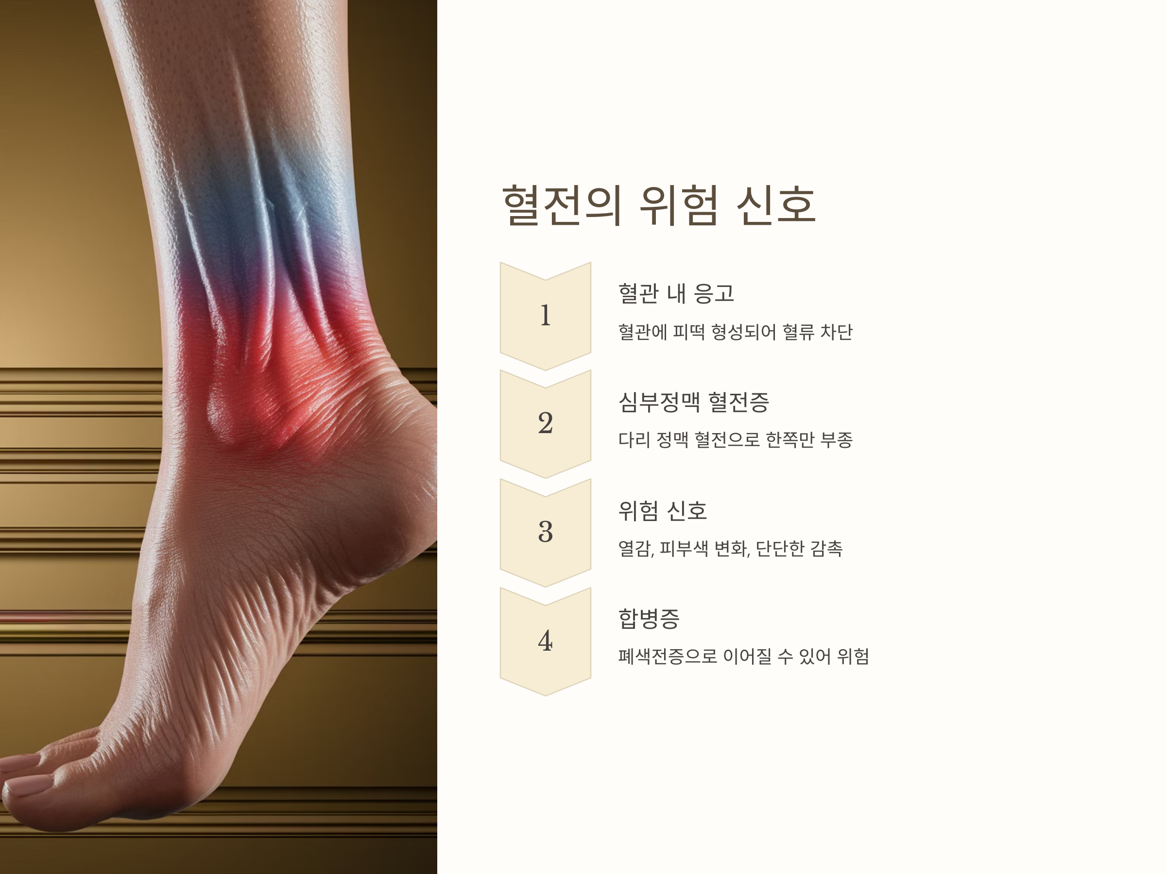 혈전은 혈관 내에 형성된 응고된 혈액 덩어리로, 이로 인해 혈류가 차단되면 해당 부위가 붓고 통증이 생기게 됩니다. 특히 '심부정맥 혈전증(DVT)'은 다리 정맥에 생긴 혈전으로 인해 한쪽 다리 또는 발목만 붓는 대표적인 원인 중 하나입니다. 이 경우 붓기 외에도 열감, 피부 색 변화(청색 혹은 붉은색), 눌렀을 때 단단한 감촉 등이 나타날 수 있습니다.