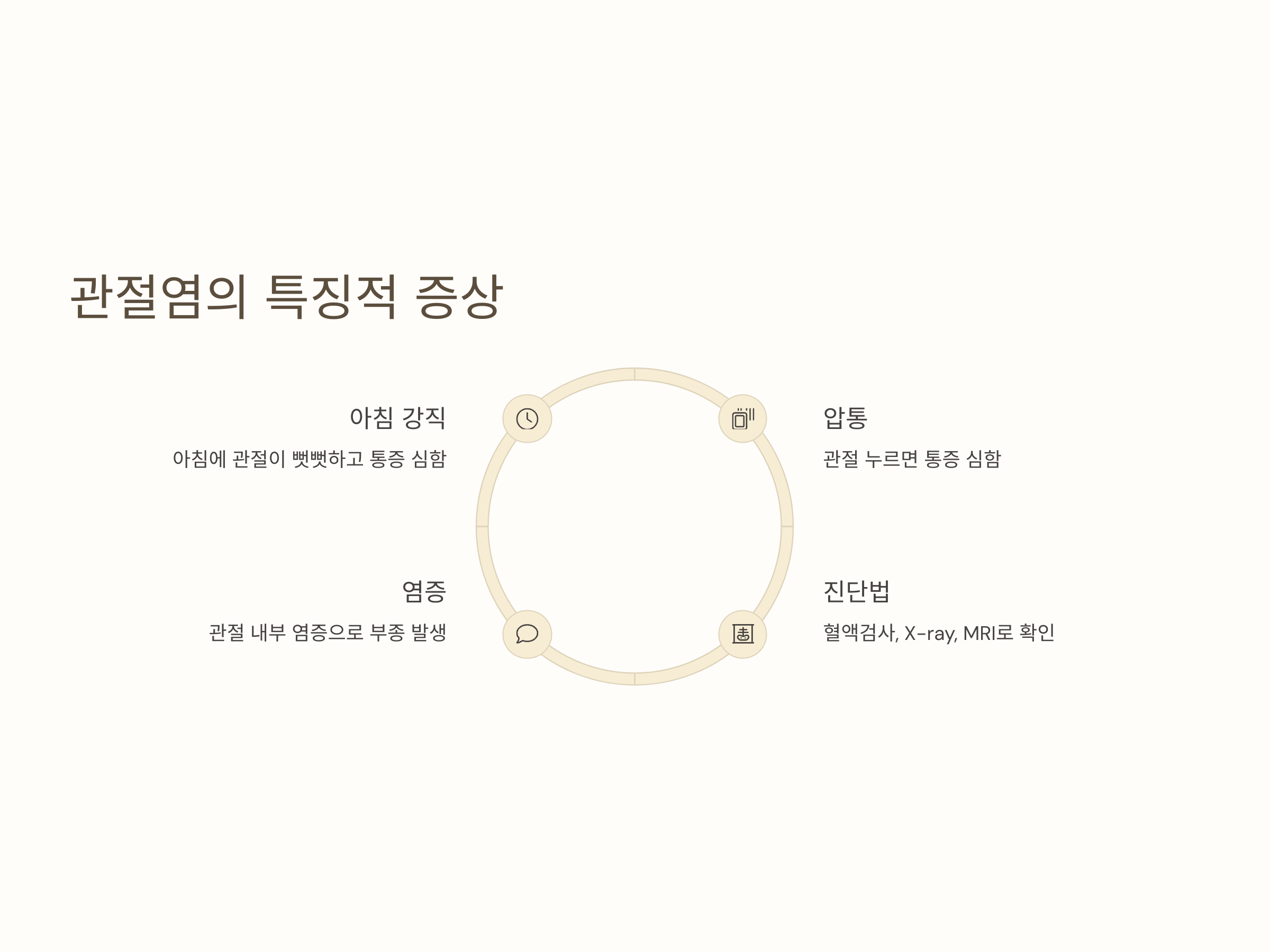 관절염은 류마티스 관절염, 통풍성 관절염, 골관절염 등 다양한 형태로 나타날 수 있으며, 모두 관절 부위의 염증을 유발하여 부종, 통증, 강직 증상을 동반합니다. 특히 아침에 일어났을 때 관절이 뻣뻣하고 통증이 심한 경우, 류마티스 관절염을 의심해볼 수 있습니다. 또한 발목 관절을 눌렀을 때 통증이 심하고 움직이기 어려운 경우도 관절염의 전형적인 증상입니다.