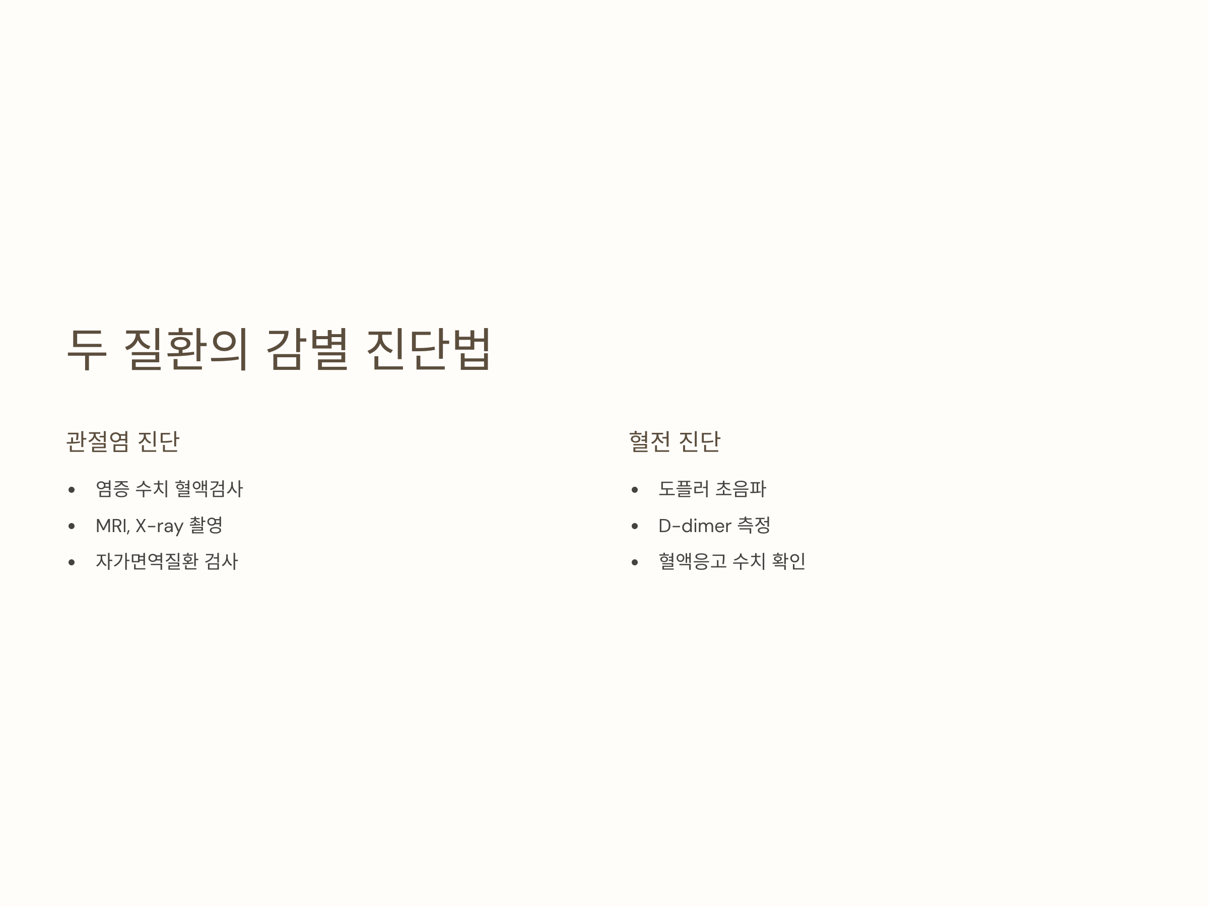 관절염과 혈전은 모두 붓기와 통증을 유발하지만, 양상의 차이와 함께 다른 진단 방법을 필요로 합니다. 관절염은 주로 관절 내부 문제이므로 염증 수치를 포함한 혈액검사, 영상 촬영(MRI, X-ray)이 필수적이며, 자가면역질환 여부도 병행 검사됩니다. 반면, 혈전은 정맥 내 혈류 흐름의 이상이므로 도플러 초음파, 혈액응고 수치(D-dimer) 측정이 가장 중요한 검사로 작용합니다.