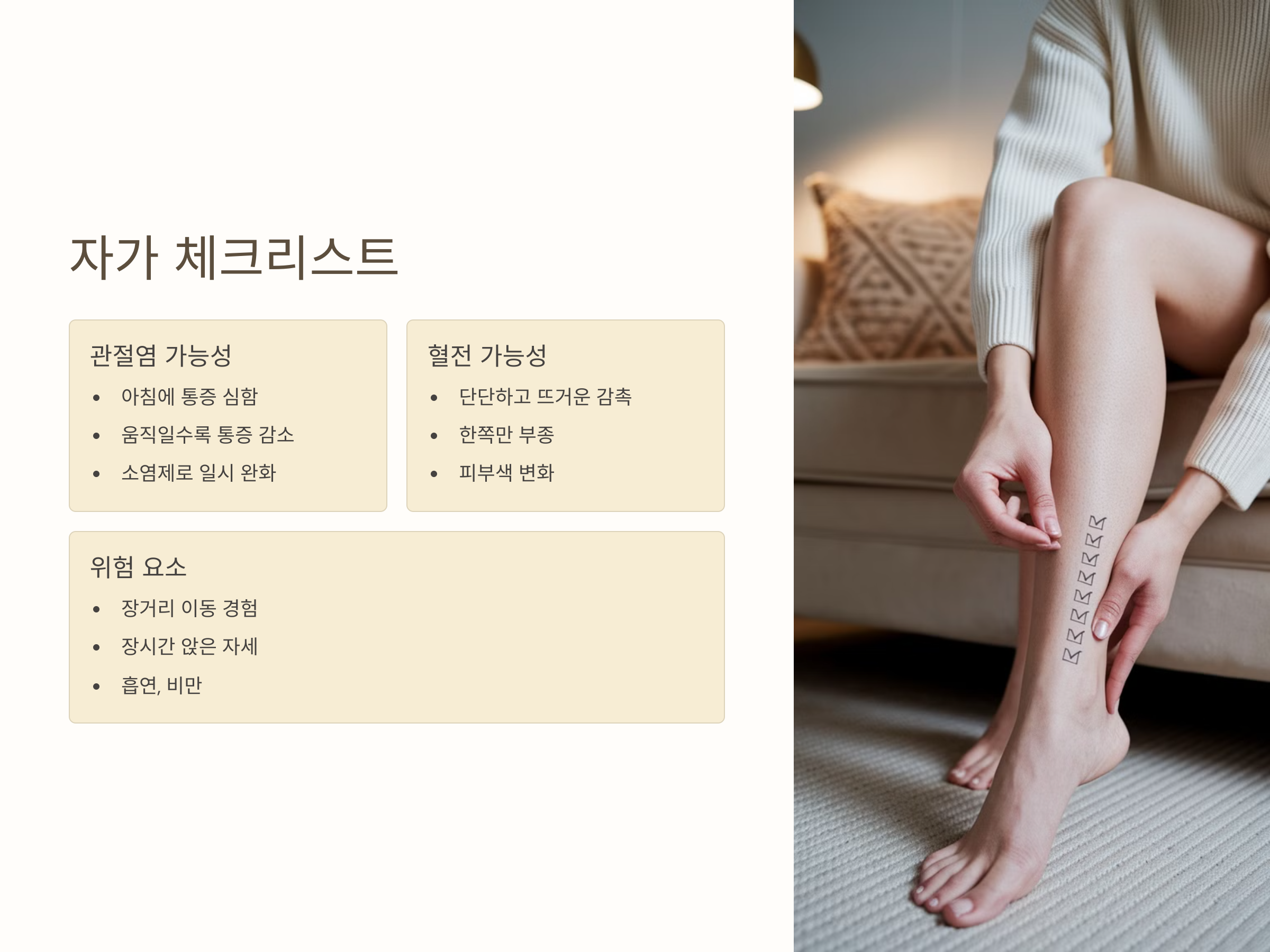 - 발목 통증이 아침에 심한가? (관절염 가능성↑)