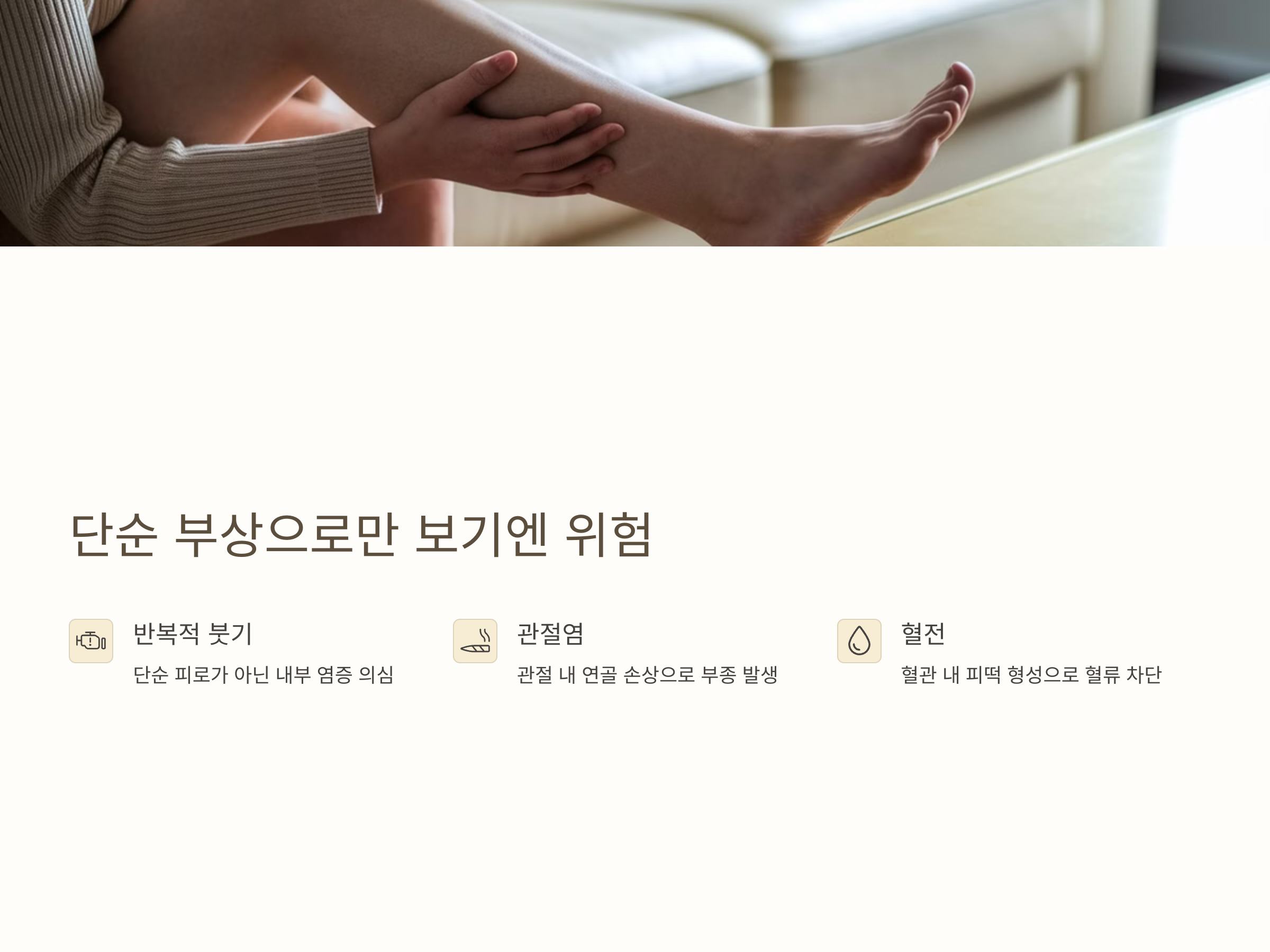 관절염과 혈전은 이러한 증상의 주요 원인 중 하나입니다. 관절염은 주로 관절 내 연골이 닳거나 염증이 생겨 부종과 통증을 유발하며, 혈전은 혈관 내 피떡이 형성되어 혈류를 막음으로써 해당 부위에 혈액이 고이고 부종이 생기게 됩니다. 이러한 병변은 초기에 적절한 대처를 하지 않으면 전신 건강에도 영향을 줄 수 있기 때문에, 증상이 지속되거나 악화된다면 정형외과 또는 혈관외과 전문의를 통해 정밀진단을 받는 것이 필요합니다.