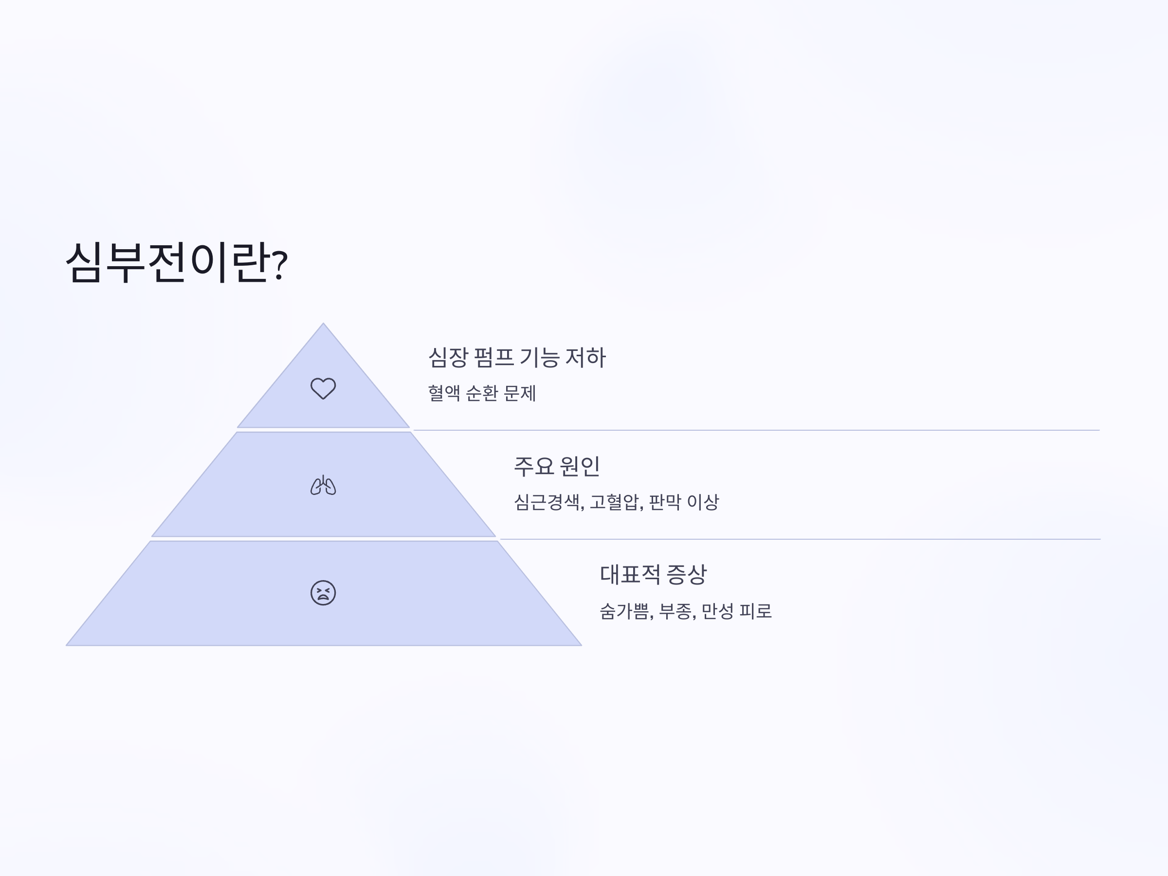 심부전은 심장이 혈액을 제대로 내보내지 못해, 신체가 필요한 만큼의 산소와 영양을 공급받지 못하는 상태입니다. 심장의 근육이 약해지거나, 너무 뻣뻣해져서 제대로 수축 또는 이완되지 않는 것이 원인입니다.