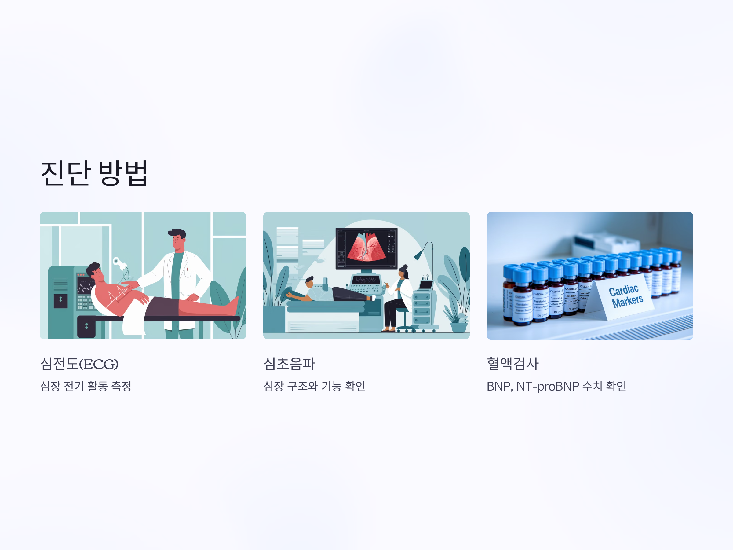이러한 증상은 심장 기능 저하를 의미할 수 있으며, 특히 50대 이상이라면 심초음파나 24시간 심전도 검사를 받아보는 것이 좋습니다. 병원에서는 ECG, 심초음파, 혈액검사(BNP, NT-proBNP 등)를 통해 심부전 또는 부정맥 여부를 정확히 진단합니다.