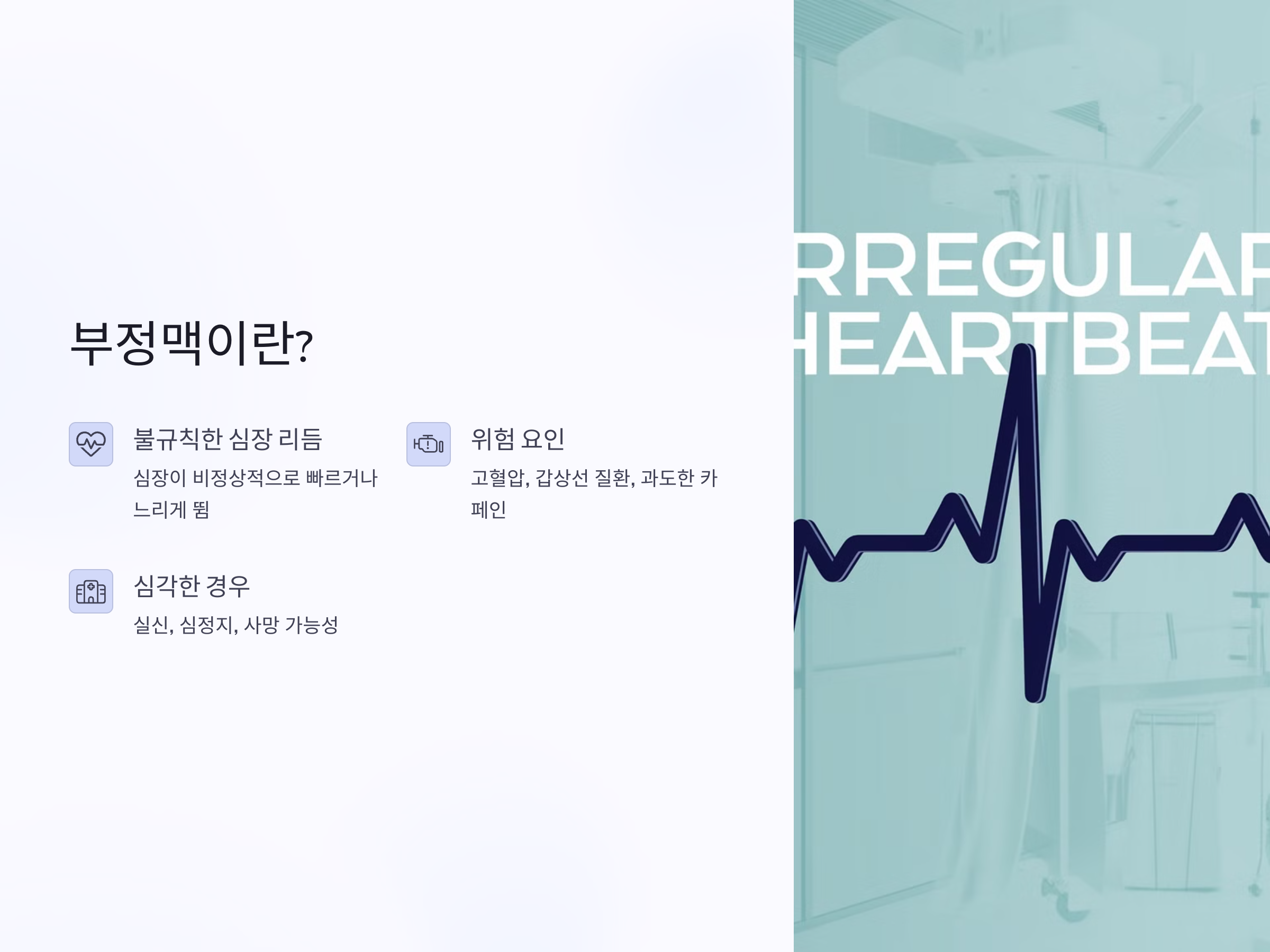 부정맥은 심장의 전기 신호 전달 체계에 이상이 생겨, 심장이 비정상적으로 빠르거나(빈맥), 느리거나(서맥), 불규칙하게 뛰는 상태를 말합니다. 대부분의 부정맥은 일시적이고 무해할 수 있으나, 심한 경우에는 실신, 심정지, 심지어 사망에 이를 수 있습니다.