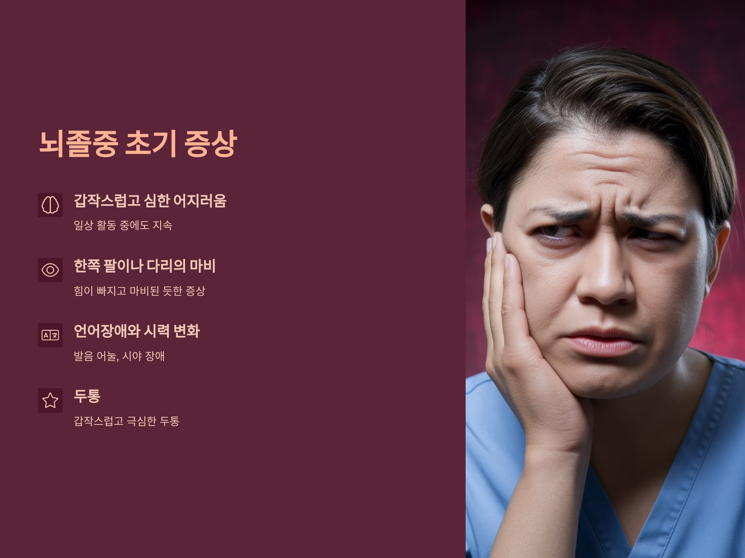 뇌졸중은 뇌의 혈류가 차단되어 뇌세포가 손상되는 질환으로, 초기 증상을 잘 인식하는 것이 매우 중요합니다. 어지럼증이 단순한 피로나 스트레스가 아닌 뇌졸중의 초기 증상일 수 있기 때문입니다.