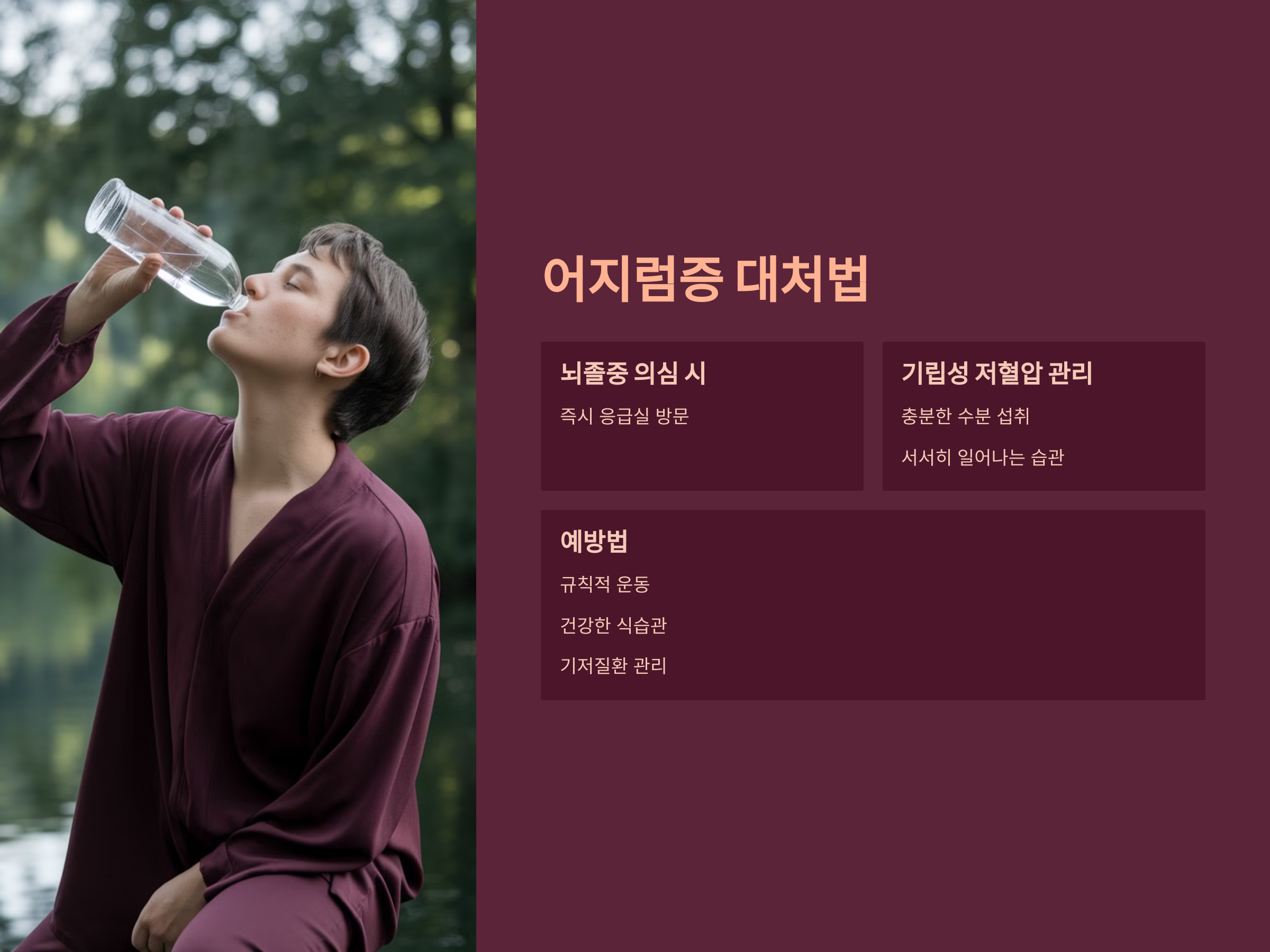 기립성 저혈압은 수분 섭취와 함께 서서히 일어나는 습관을 들이는 것이 도움이 됩니다. 또한 의사의 상담을 통해 적절한 치료법을 찾는 것이 중요합니다.