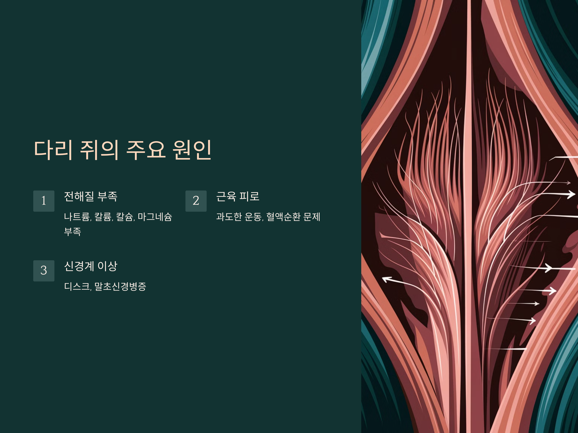 다리에 쥐가 나는 현상은 주로 근육 경련(muscle cramp) 때문입니다. 이는 신경 자극이 과도하게 발생하거나 근육이 갑자기 수축하면서 통증을 유발하는 현상인데, 주요 원인은 다음과 같습니다.