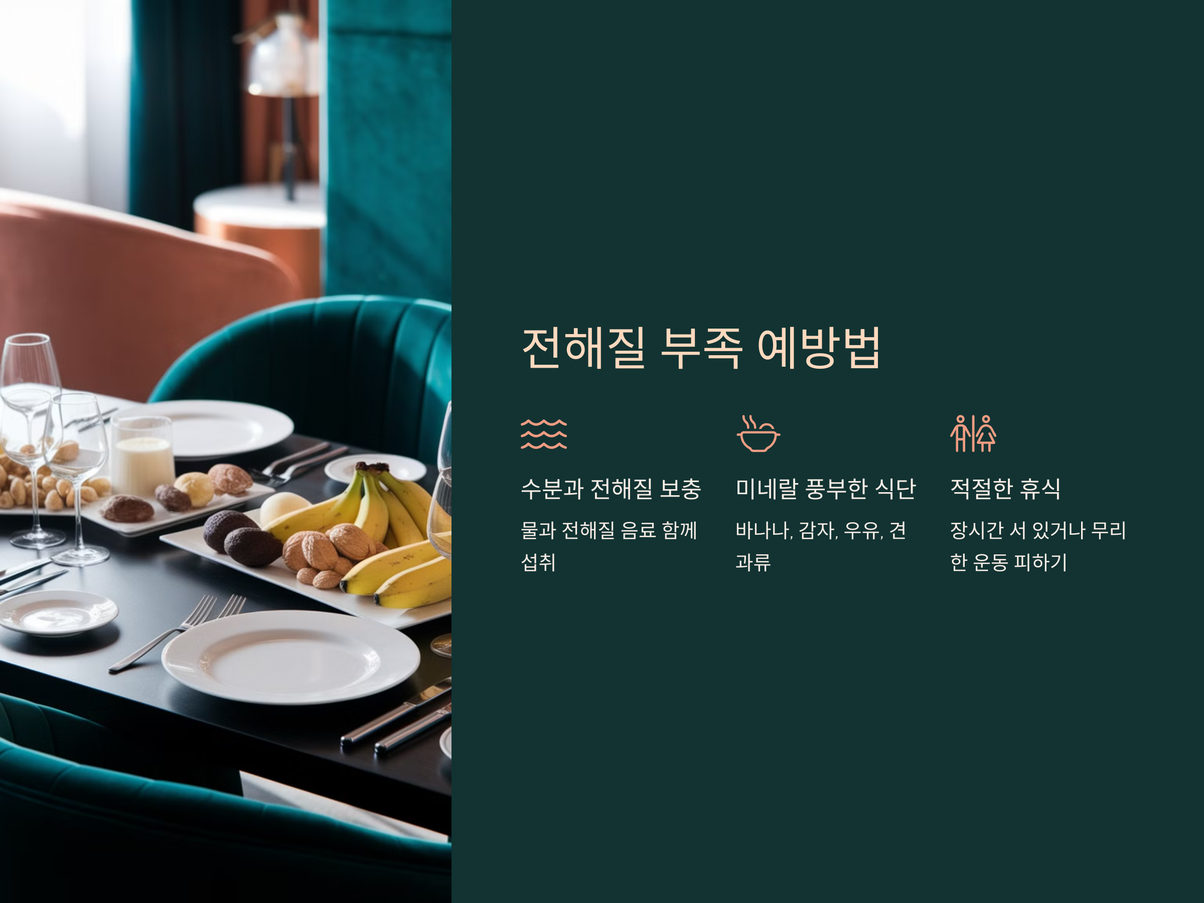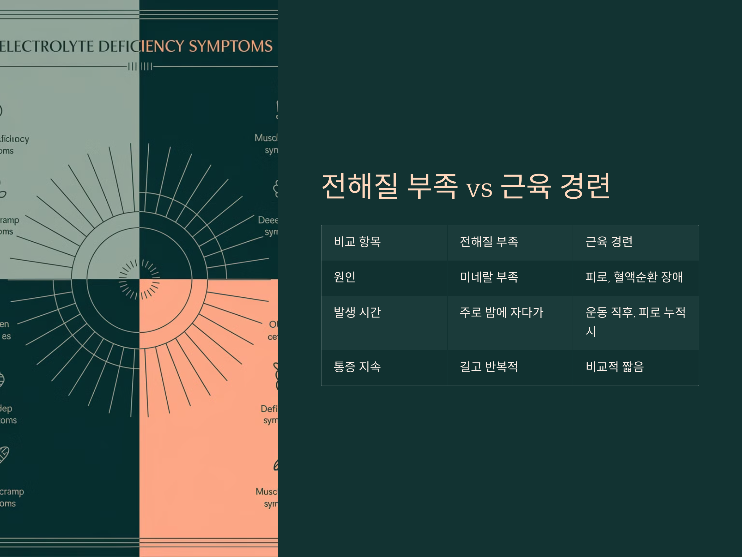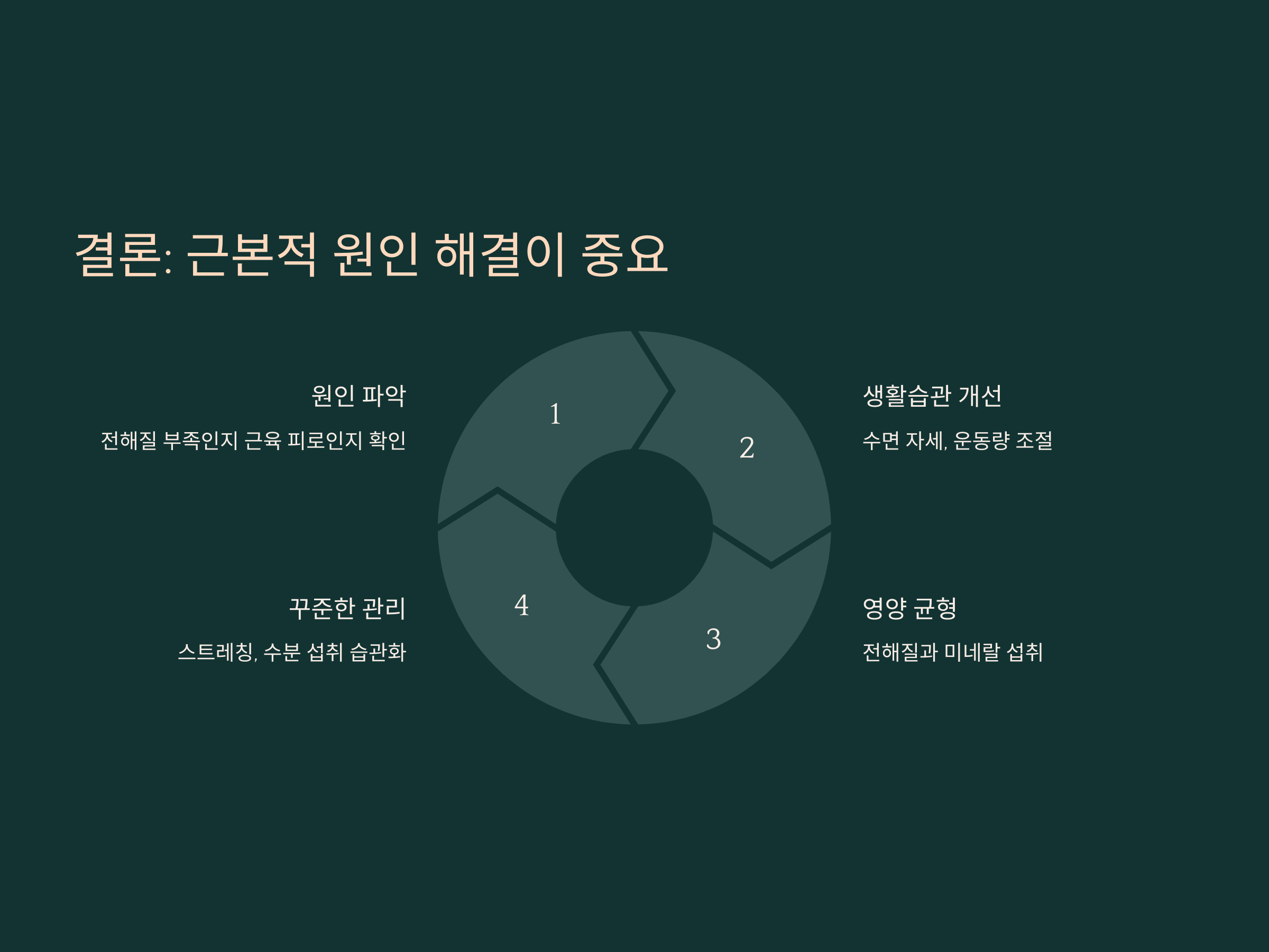 특히 전해질 부족은 특정 영양소 섭취로 조절할 수 있지만, 근육 경련은 생활습관 개선이 더 중요합니다.
