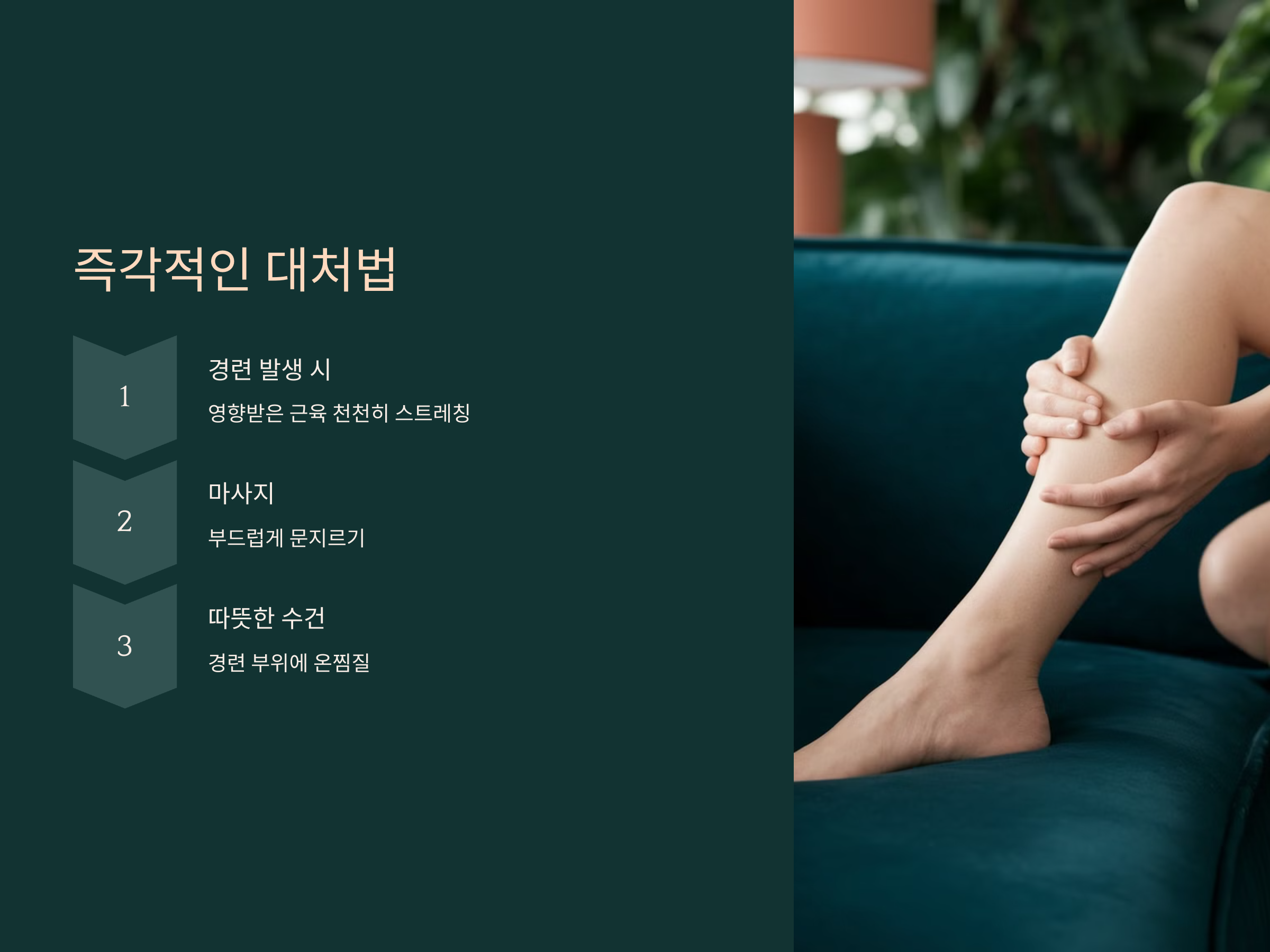 | 해결 방법 | 전해질 보충(미네랄 포함된 식단, 수분 섭취) | 스트레칭, 마사지, 온찜질 |