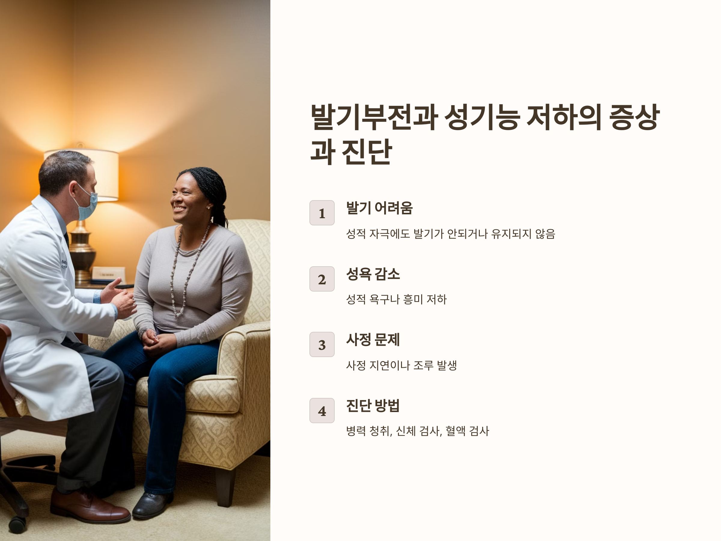 - 심리 치료: 심리적 요인이 원인인 경우, 심리 상담이나 성치료를 통해 문제를 해결할 수 있습니다. 이는 스트레스 관리와 우울증 치료에도 도움이 됩니다.